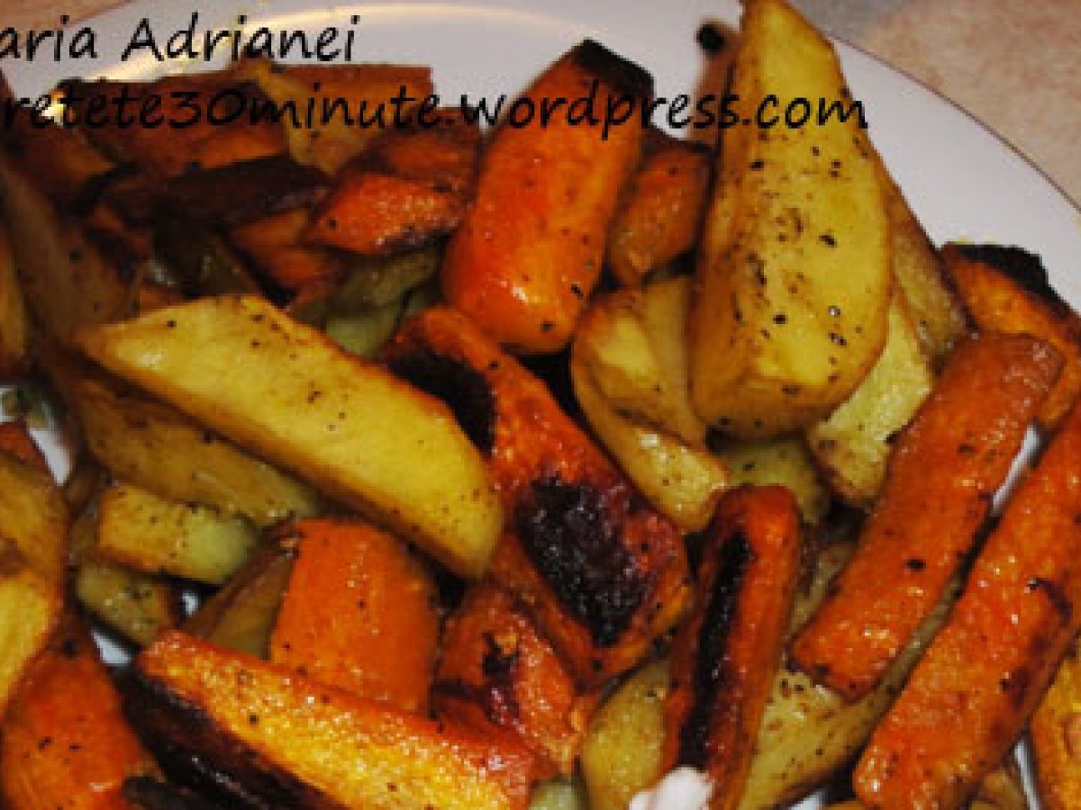 Cartofi si morcovi copti la cuptor PrecedentulUrmătorul Felul principalFoarte ușor40 min367 Kcal Trimite unui prieten Printează pagina Adresează o întrebare autorului Postează o poză cu rețeta gătită de tine Ingrediente 4 6 cartofi medii spalati bine de tot si taiati in cubulete sau pe lungime 4 morcovi spalati, curarati si taiati in cubulete 1 lingurita rozmarin 1 lingurtia sare 1 lingurita piper 4 catei de usturoi zdrobiti sare 4 linguri ulei de masline Cost estimat: 3.18Euros€ (0.8€/porție)
