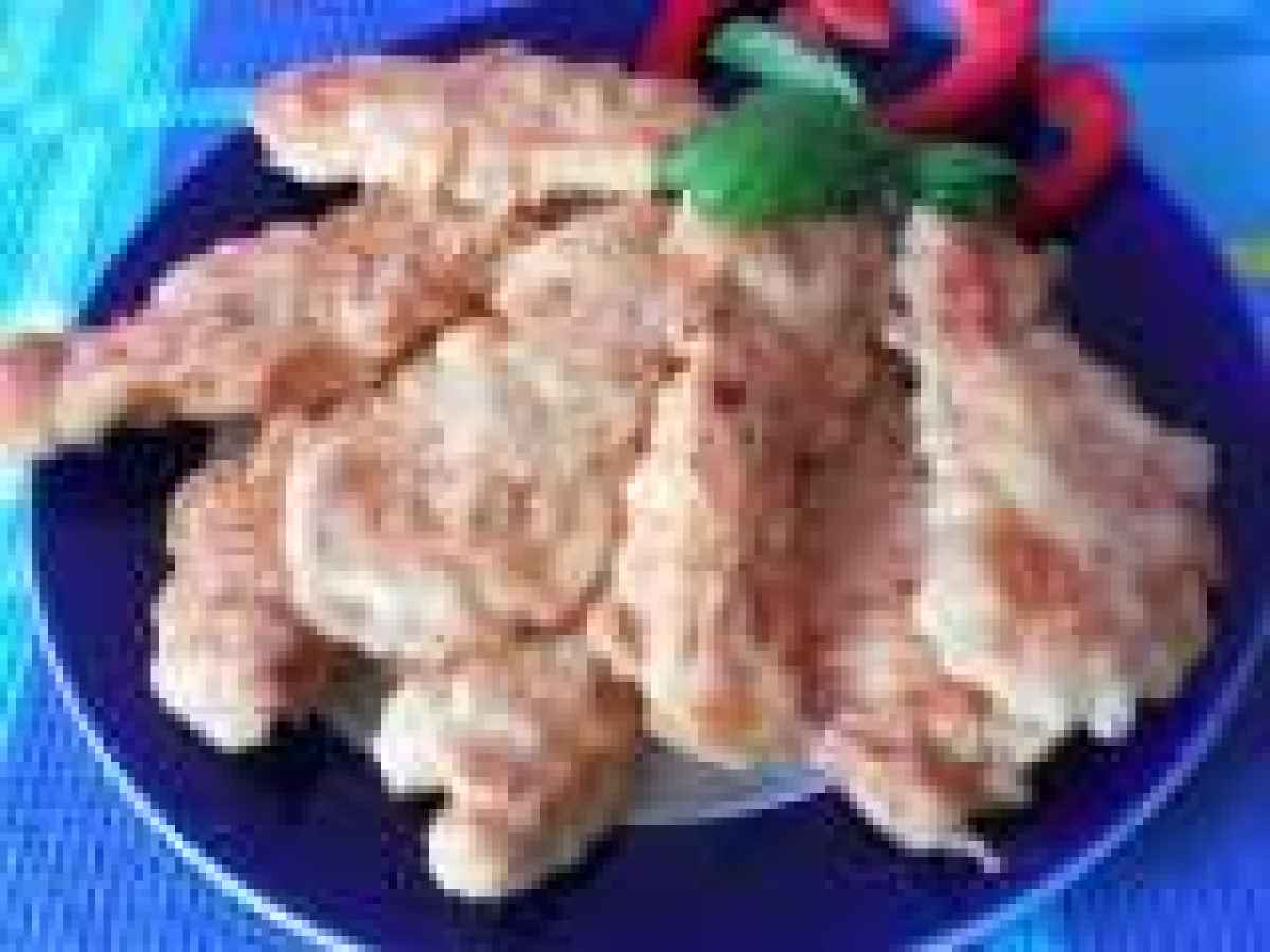 In continuare, preparam pane-ul asa cum dorim: eu l-am facut din ou amestecat cu o lingura de apa si faina. Scoatem fasiile din pui din nmarinat, le intindem pe un tocator si le presaram cu sare si piper; le trecem prin faina, prin oua, si le prajim in uleiul incins; dupa ce au "inflorit " pe o parte, le intoarcem imediat pe cealalta parte, ca sa fie frumoase; daca le lasam mai intai sa se prajeasca numai pe o parte, se va scurge oul de pe partea de deasupra a snitelului; le prajim la foc mediu spre mic, pe o parte si pe alta: sunt gata cand furculita intra usor in ele. Le scoatem pe servete de hartie si le servim ca aperitiv...........