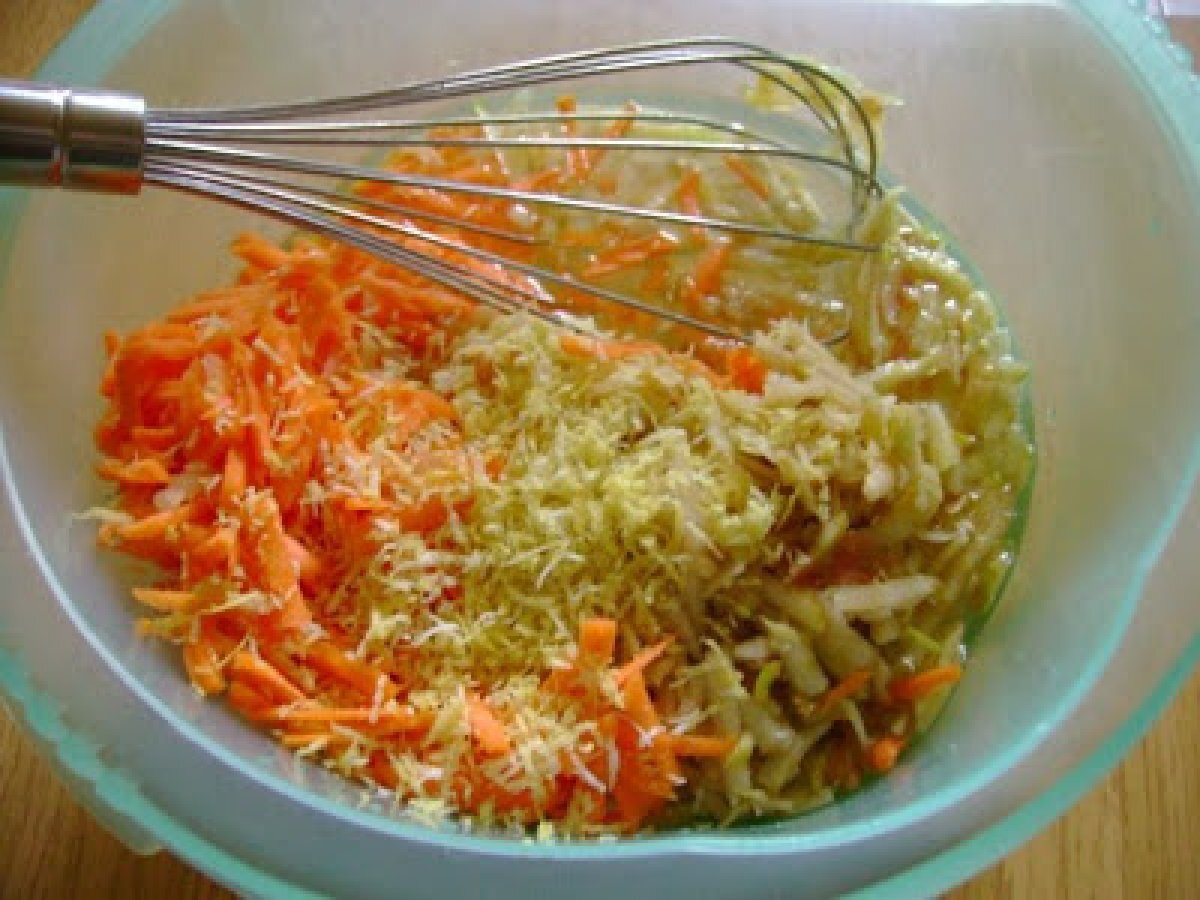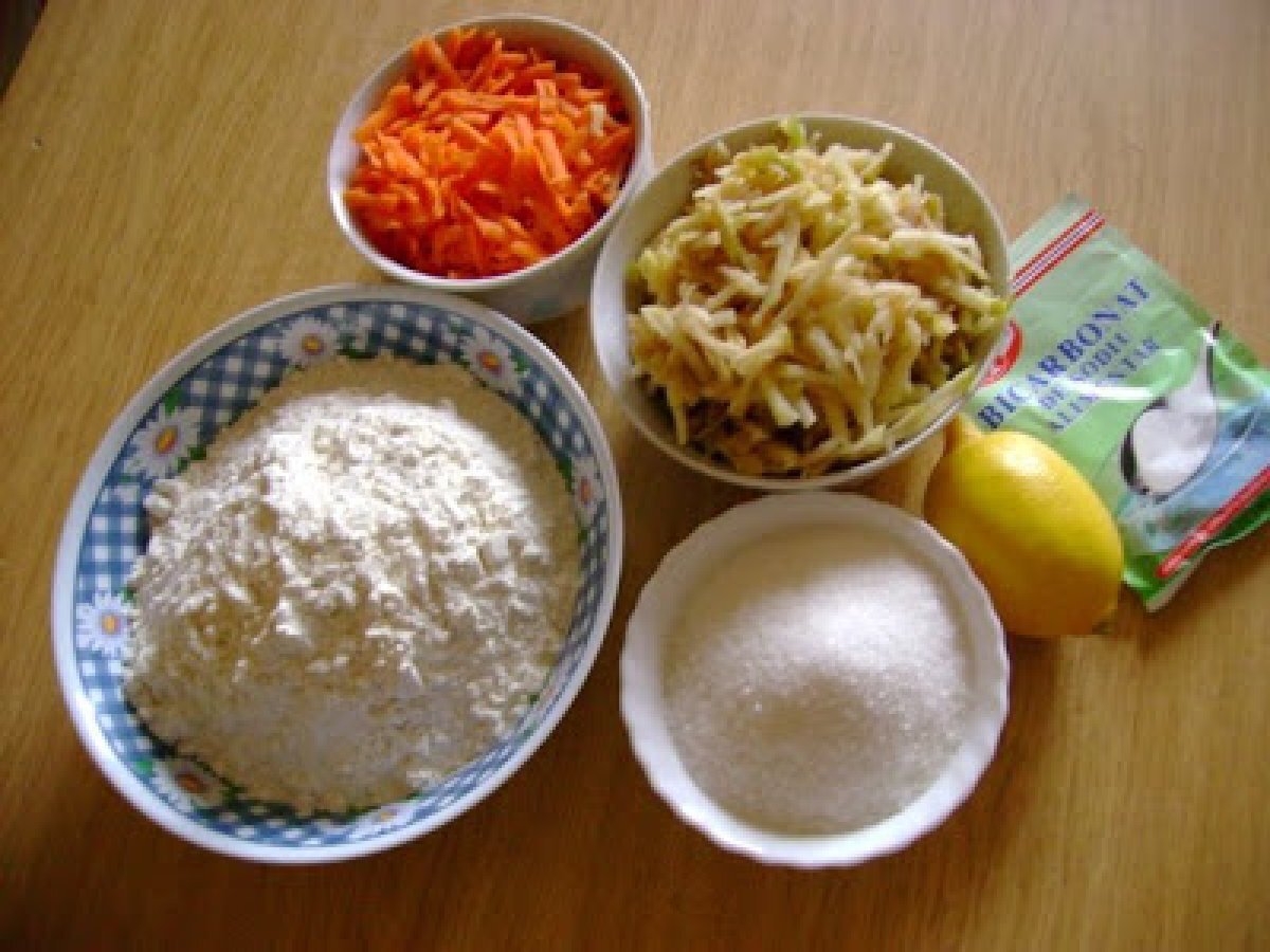Chec cu mar si morcov PrecedentulUrmătorul Felul principalFoarte ușor45 min Trimite unui prieten Printează pagina Adresează o întrebare autorului Postează o poză cu rețeta gătită de tine Este un chec deosebit de bun, are o aroma minunata. Ingrediente 4 1 cana morcov ras 1 cana mar ras 200 g zahar 50 ml ulei de floarea soarelui ½ ceasca suc de portocala 100 ml apa minerala 300 g faina 1 plic praf de copt 1 lingurita bicarbonat de sodiu 1 lingurita scortisoara coaja rasa de lamaie si portocala