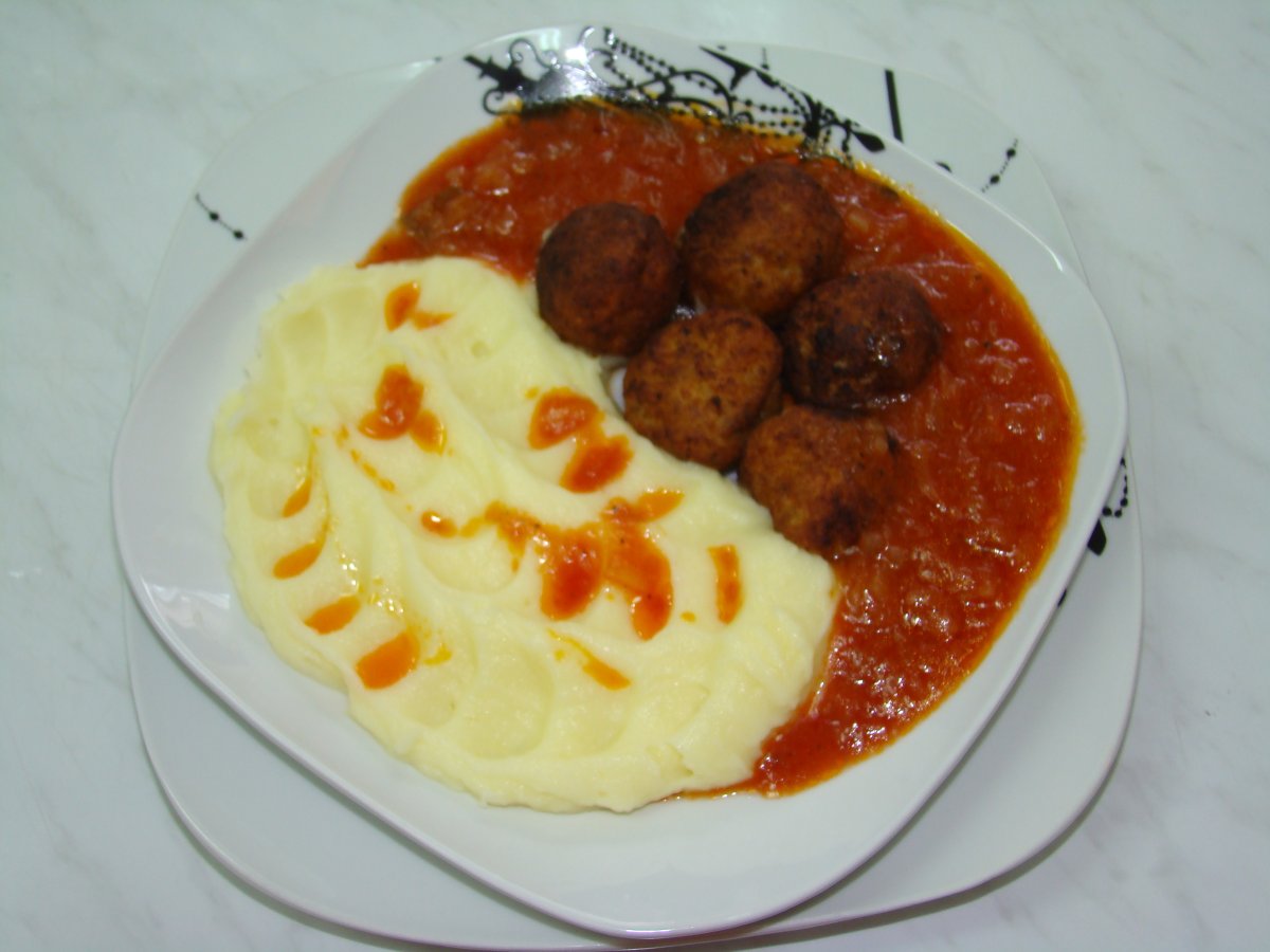 Chiftelute cu sos dulce-picant si piuree de cartofi PrecedentulUrmătorul Felul principalUșor1 h 30 m Trimite unui prieten Printează pagina Adresează o întrebare autorului Postează o poză cu rețeta gătită de tine Ingrediente 6 Pentru chiftelute: 1/2 kg carne de porc mai grasuta 1/2 kg piept de pui 200 g pesmet 200-300 ml lapte 3 oua 3 catei de usturoi piper sare Pentru sos avem nevoie de: 2 cepe 100 ml ulei 1 lingurita pasta de ardei iute 500 g rosii tocate pasta rustica 2-3 linguri de zahar sare piper proaspat macinat 2-3 foi de dafin Pentru piuree de cartofi avem nevoie de: 1,5 kg cartofi albi apa sare 1/2 pachet de unt 100-200 ml lapte