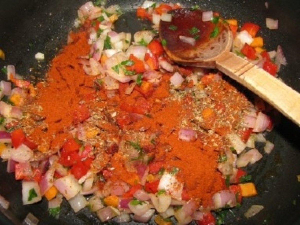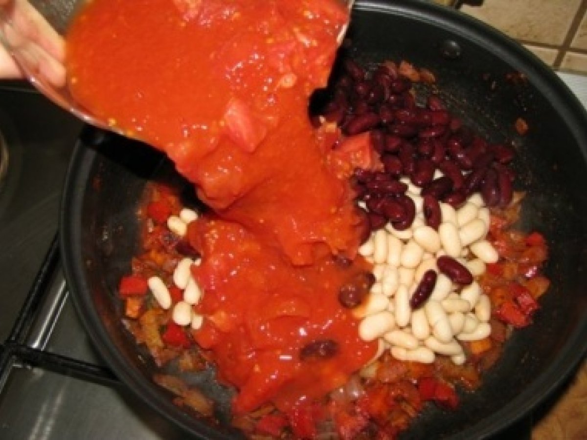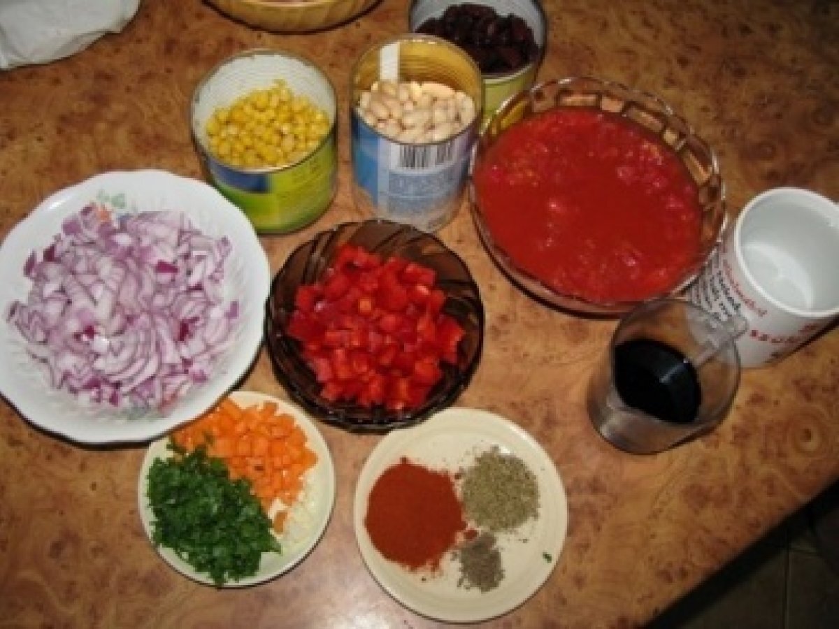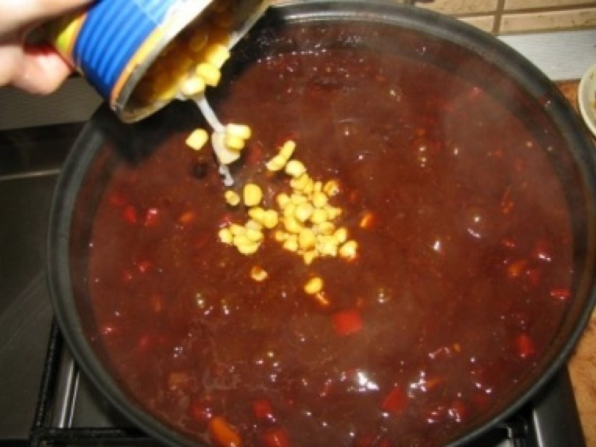 Chili cu fasole colorata, rosii si porumb PrecedentulUrmătorul Felul principalFoarte ușor1 h 30 m Trimite unui prieten Printează pagina Adresează o întrebare autorului Postează o poză cu rețeta gătită de tine Ingrediente 6 2 linguri ulei 1 ceapa mare, tocata 2 catei de usturoi, tocati 1 ardei gras rosu, curatat si tocat 1 morcov mic, curata si tocat 1 tija de telina mica, tocata marunt 3 linguri boia de ardei iute 2 linguri paprika dulce 2 lingurite oregano uscat 1 lingurita cumin 1 conserva (800 g) pulpa de rosii cu sos 1 conserva (400 g) fasole alba, scursa si calita 1 conserva (400 g) fasole rosie, scursa si calita 250 ml apa 60 ml sos de soia 2 lingurite amidon alimentar amestecat cu 30 ml apa 1 conserva (300 g) boabe de porumb