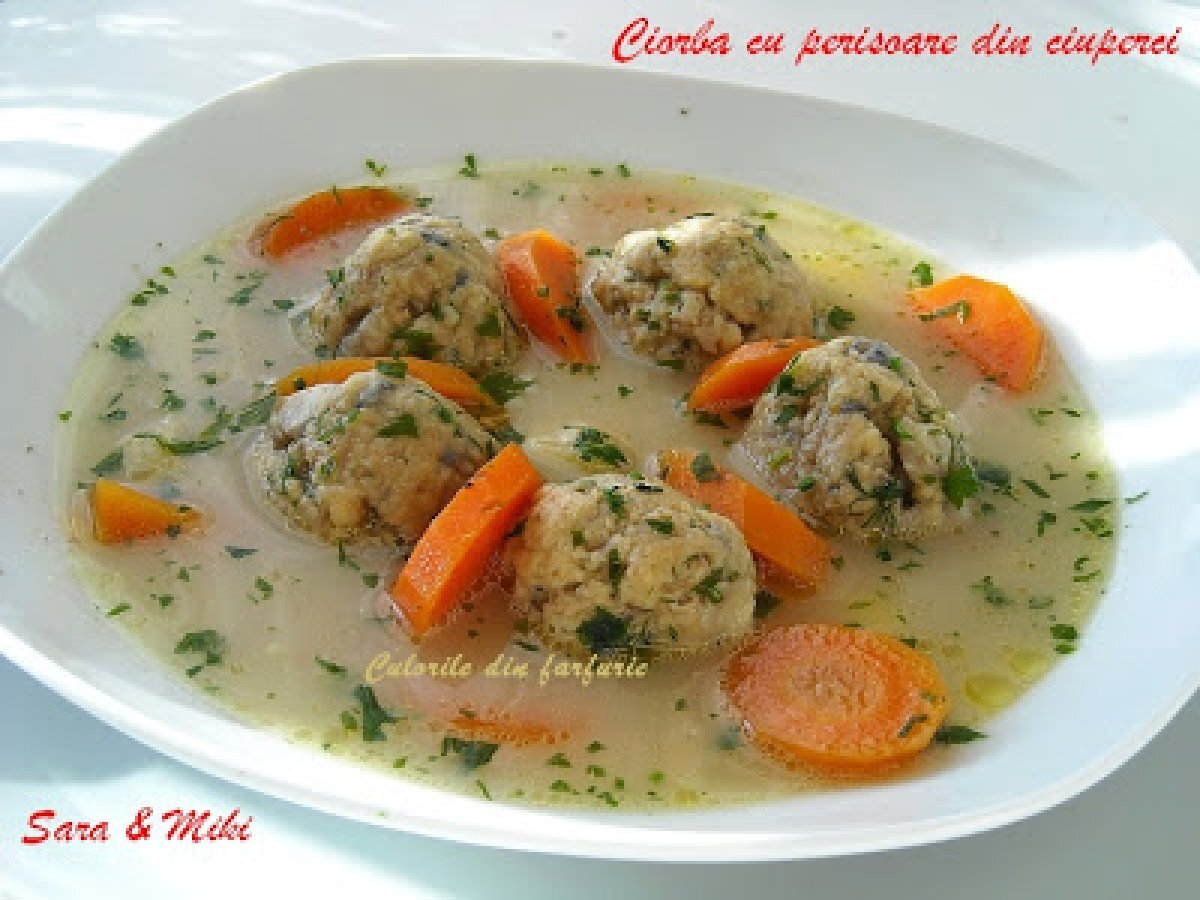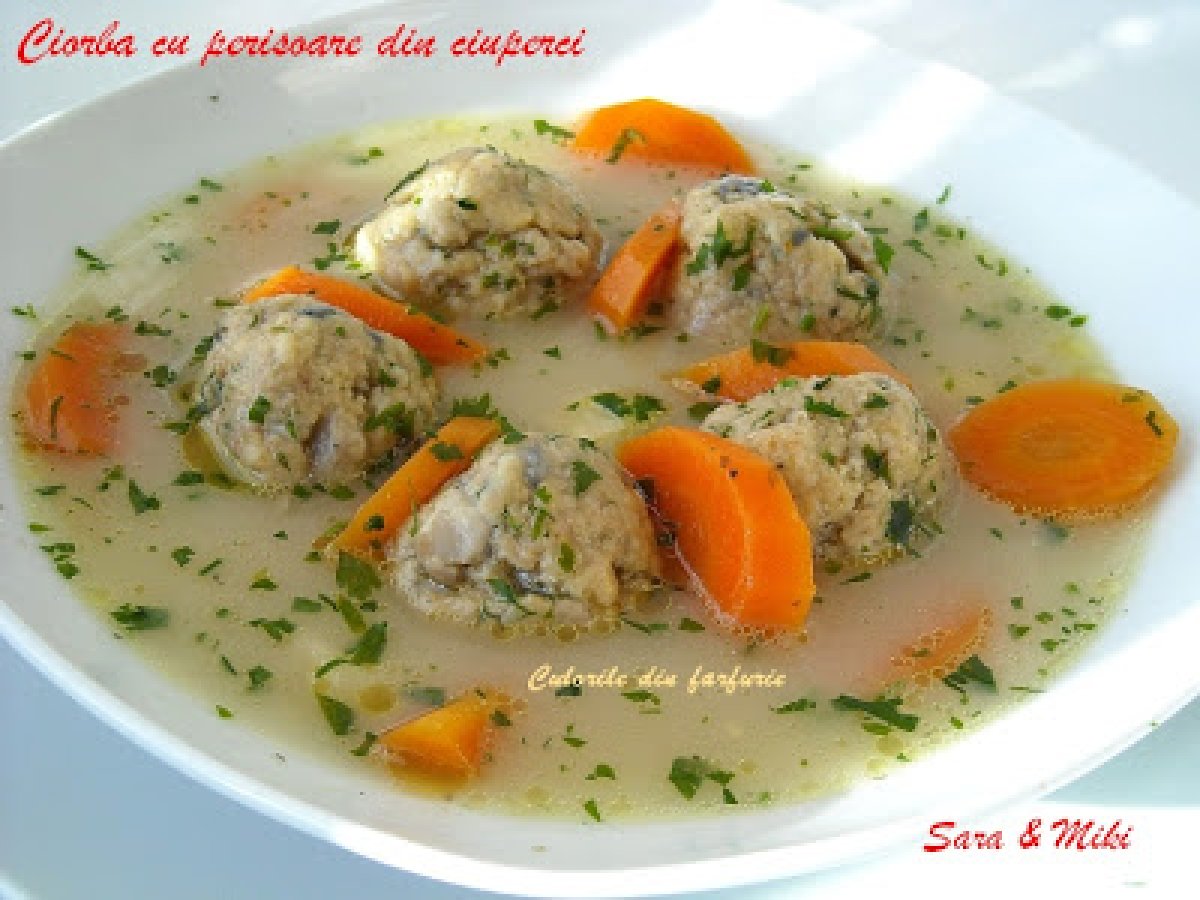 Ciorba cu perisoare din ciuperci PrecedentulUrmătorul Felul principalFoarte ușor40 min Trimite unui prieten Printează pagina Adresează o întrebare autorului Postează o poză cu rețeta gătită de tine Ingrediente 4 400 g ciuperci proaspete 1 morcov mare 1 radacina patrunjel 2 cepe 1/2 telina mica 1 lg de orez 2-3 lg suc de rosii 1 ou batut usor 1-2 lg smantana 1-2 lg pesmet sare piper 1 lingura. patrunjel tocat