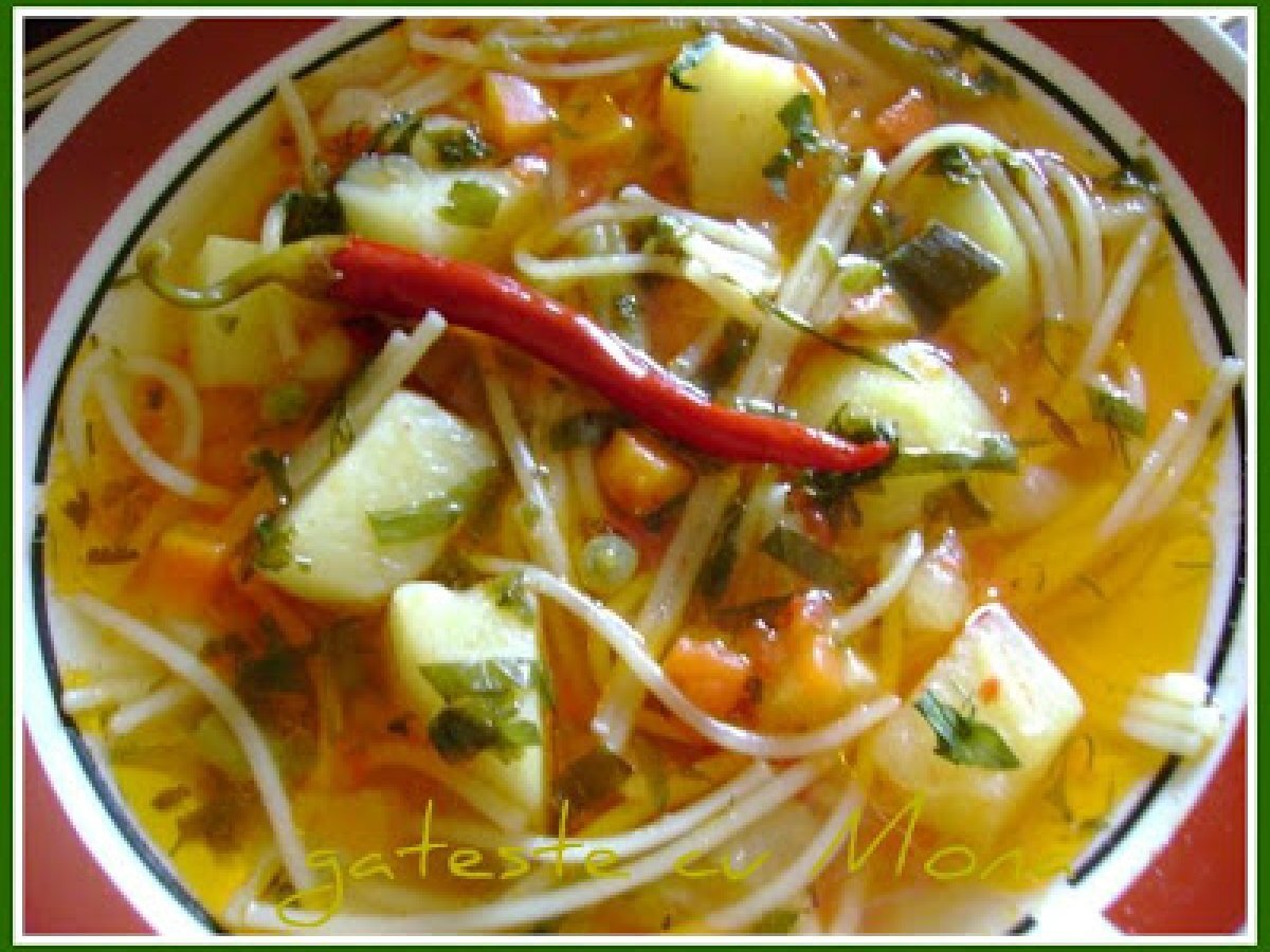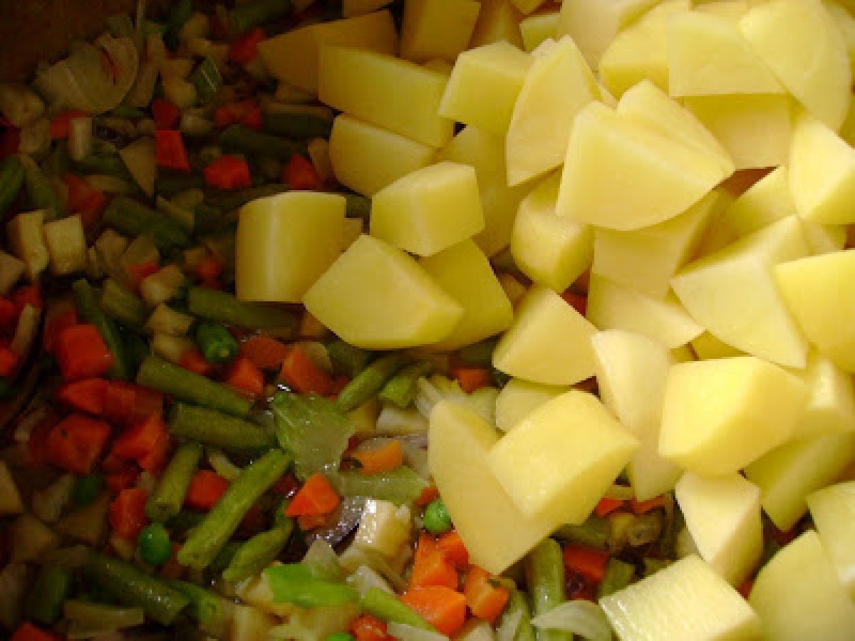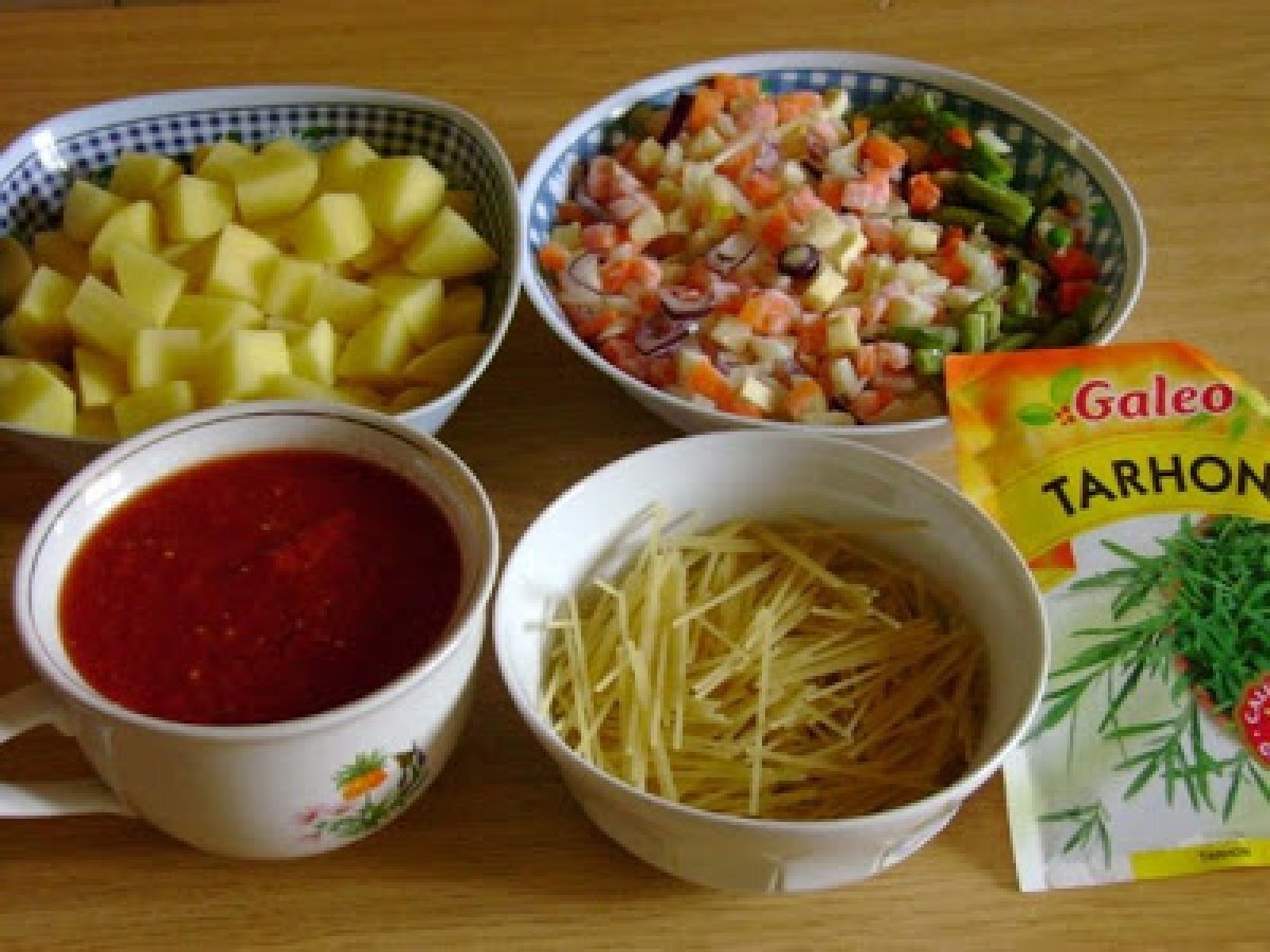 Ciorba de legume cu tarhon PrecedentulUrmătorul Felul principalFoarte ușor1 oră Trimite unui prieten Printează pagina Adresează o întrebare autorului Postează o poză cu rețeta gătită de tine Ingrediente 2 2 morcovi 2 albituri (pastarnac, patrunjel) 1 telina mica 2 cepe 3 cartofi 100g mazare 100g fasole verde 100g paste fainoase 300ml suc de rosii 3 litri supa de legume sau apa 4 linguri de ulei 1 lingura tarhon verdeata taiata marunt sare, piper