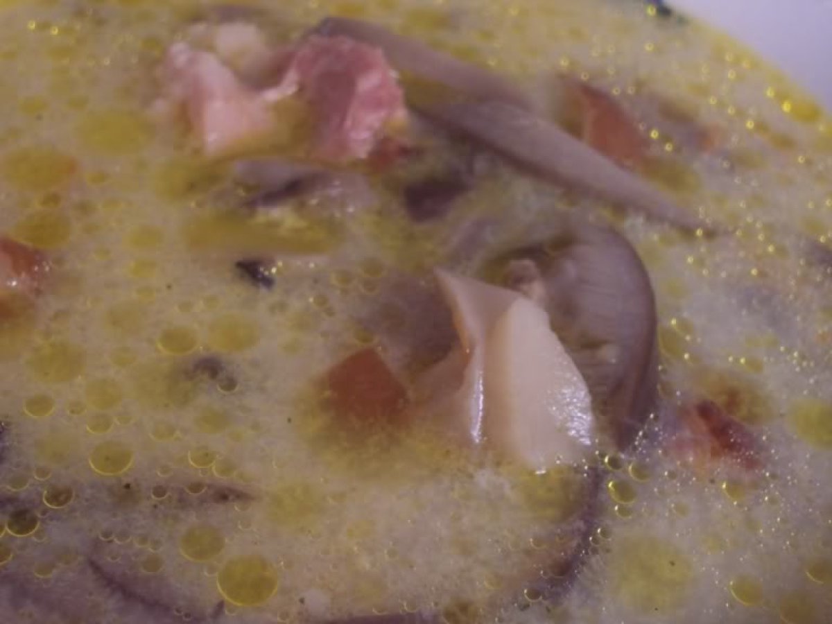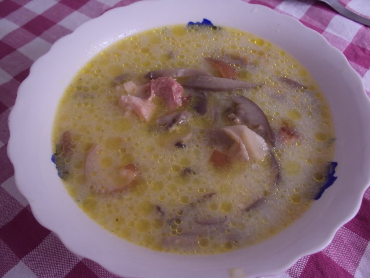 Ciorba de pleurotus cu ciolan afumat PrecedentulUrmătorul Felul principalFoarte ușor50 min Trimite unui prieten Printează pagina Adresează o întrebare autorului Postează o poză cu rețeta gătită de tine Ingrediente 4 1kg ciuperci pleurotus 1 morcov mare 1 ciolan afumat 6 linguri ulei 4 oua 2 cani de lapte piper macinat sare