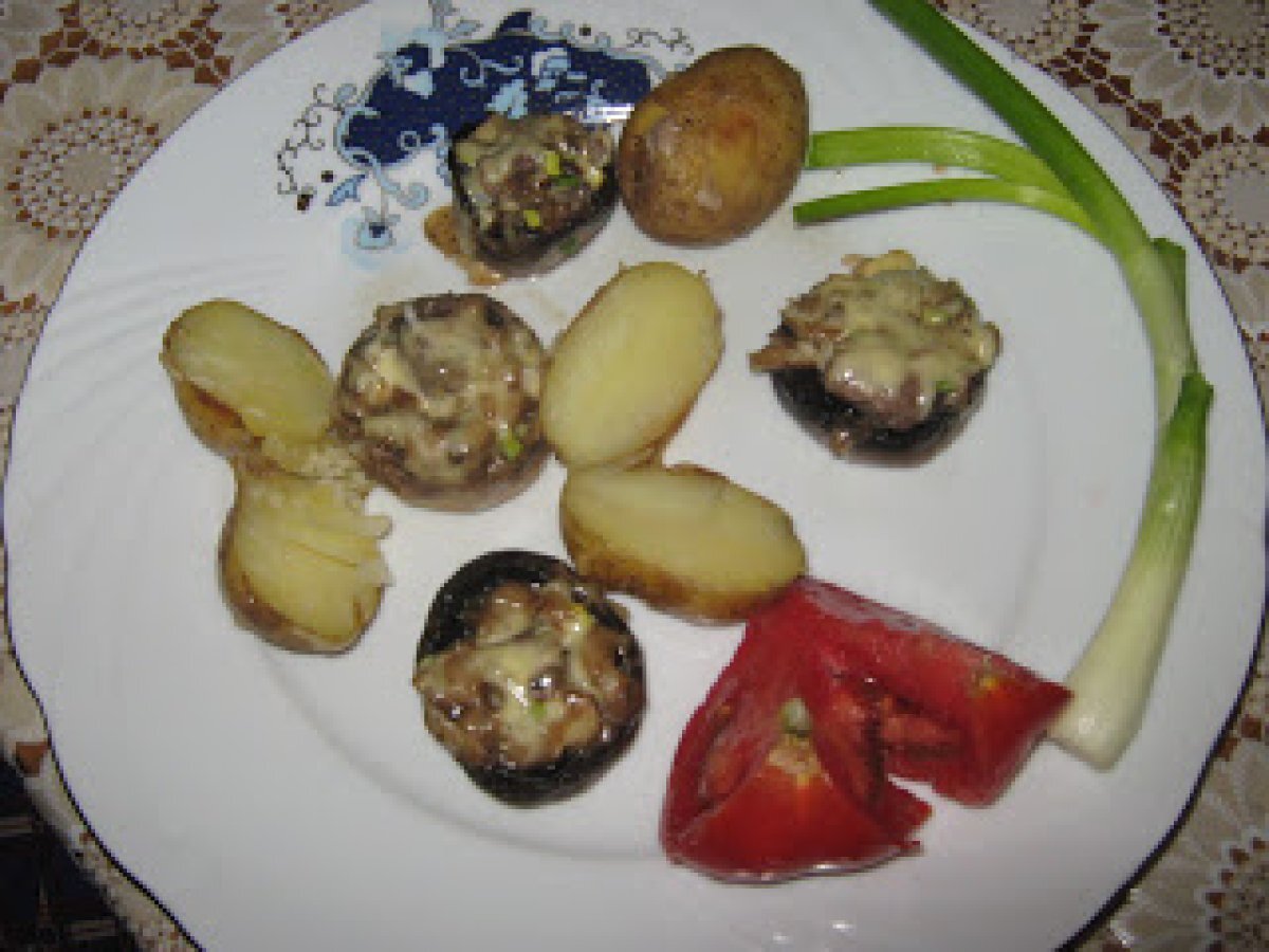 Ciuperci umplute cu garnitura de cartofi copti Felul principalFoarte ușor30 min Trimite unui prieten Printează pagina Adresează o întrebare autorului Postează o poză cu rețeta gătită de tine Ingrediente 4 1/2 ciuperci champinion 100 g muschiulet de porc afumat un fir ceapa verde 100 g cascaval ras sare si piper