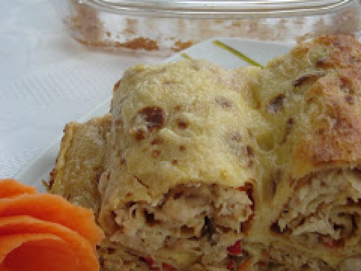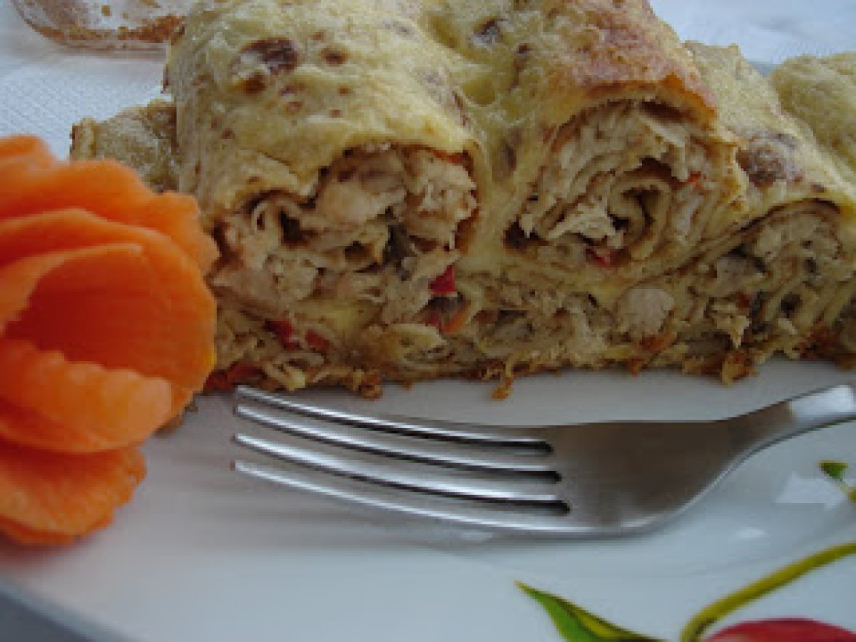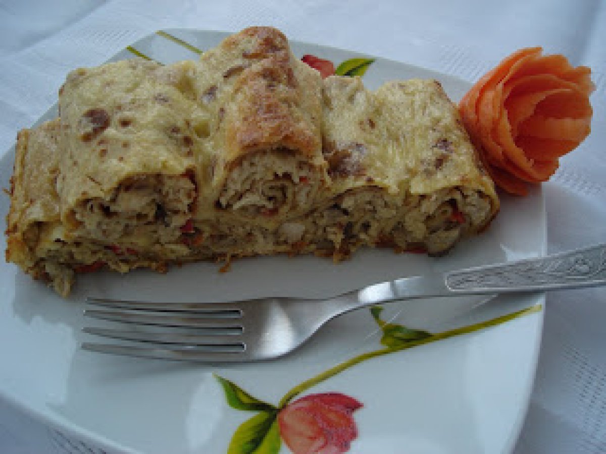 Clatite gratinate umplute cu carne de pui si ciuperci PrecedentulUrmătorul Felul principalFoarte ușor40 min Trimite unui prieten Printează pagina Adresează o întrebare autorului Postează o poză cu rețeta gătită de tine Ingrediente 4 un puiaprox. 1kg, 200 g slanina, 500 g ciuperci, o ceapa, un ardei gras rosu, 250 g cascaval, 3 oua, smantana, vegeta, sare, piper.