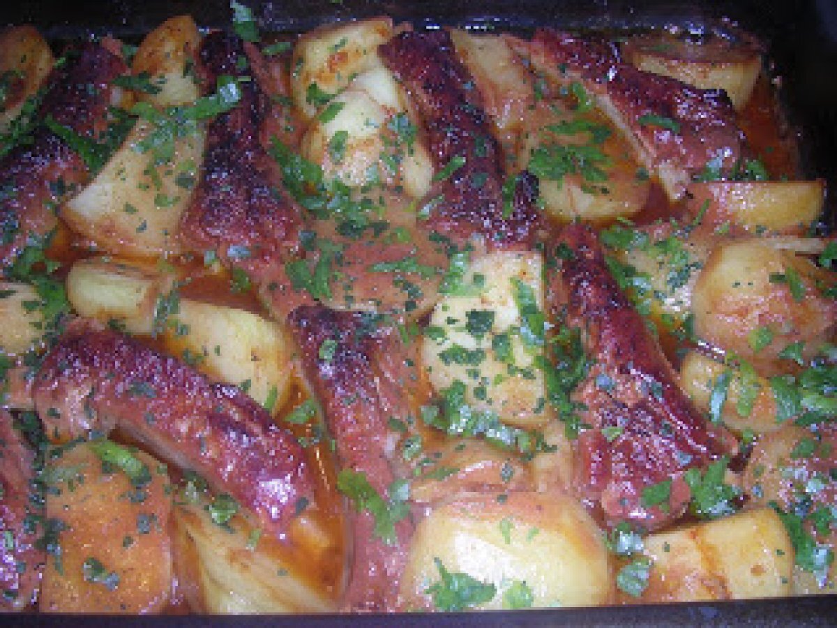Coaste de porc cu cartofi la cuptor PrecedentulUrmătorul Felul principalFoarte ușor56 min Trimite unui prieten Printează pagina Adresează o întrebare autorului Postează o poză cu rețeta gătită de tine Ingrediente 6 1 kg coaste de porc 1 kg de cartofi o jumatate de capatana de usturoi 1 lingurita de boia de ardei dulce 1/2 lingurita de piper 1/2 lingurita de cimbru 1 lingurita de sare 250 ml pasta de rosii 150 ml ulei patrunjel pentru decor