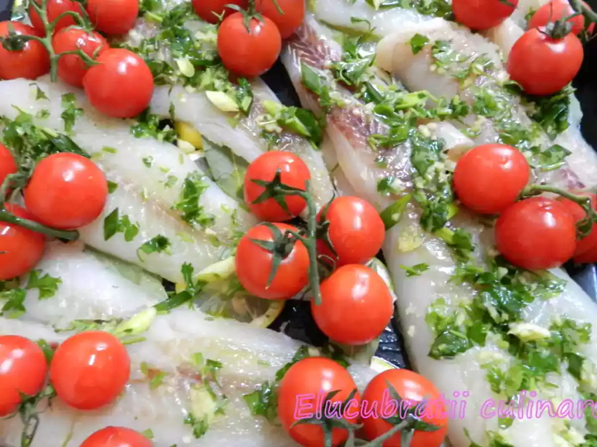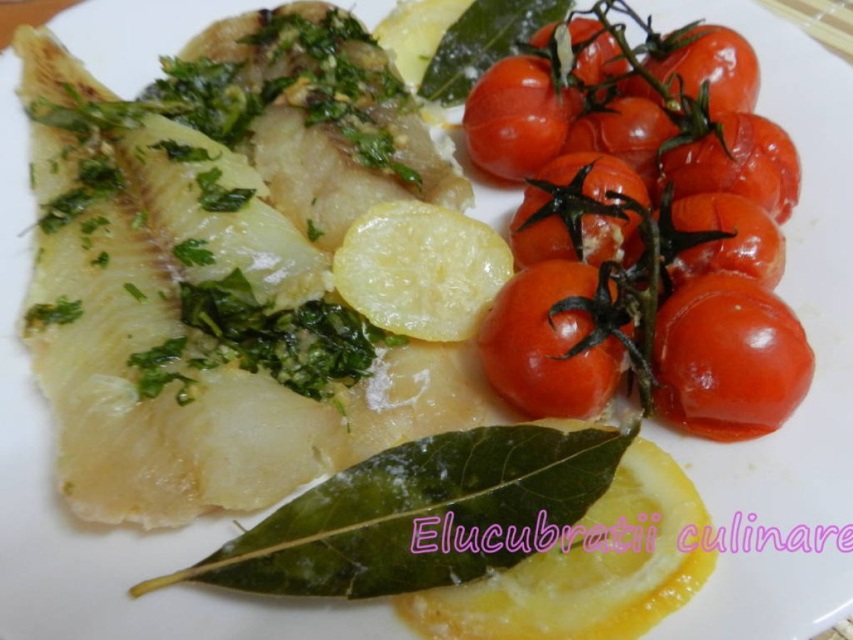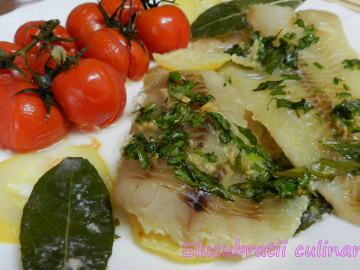 Cod cu dafin și lămâie PrecedentulUrmătorul Felul principalFoarte ușor40 min Trimite unui prieten Printează pagina Adresează o întrebare autorului Postează o poză cu rețeta gătită de tine O explozie de arome Ingrediente 4 1 kg cod file, 3 linguri ulei de măsline, 2 lămâi, 8 foi de dafin, 500 g roșii cherry, 1 legătură pătrunjel, 5 căței de usturoi, 3 linguri ulei de măsline, sare, piper.