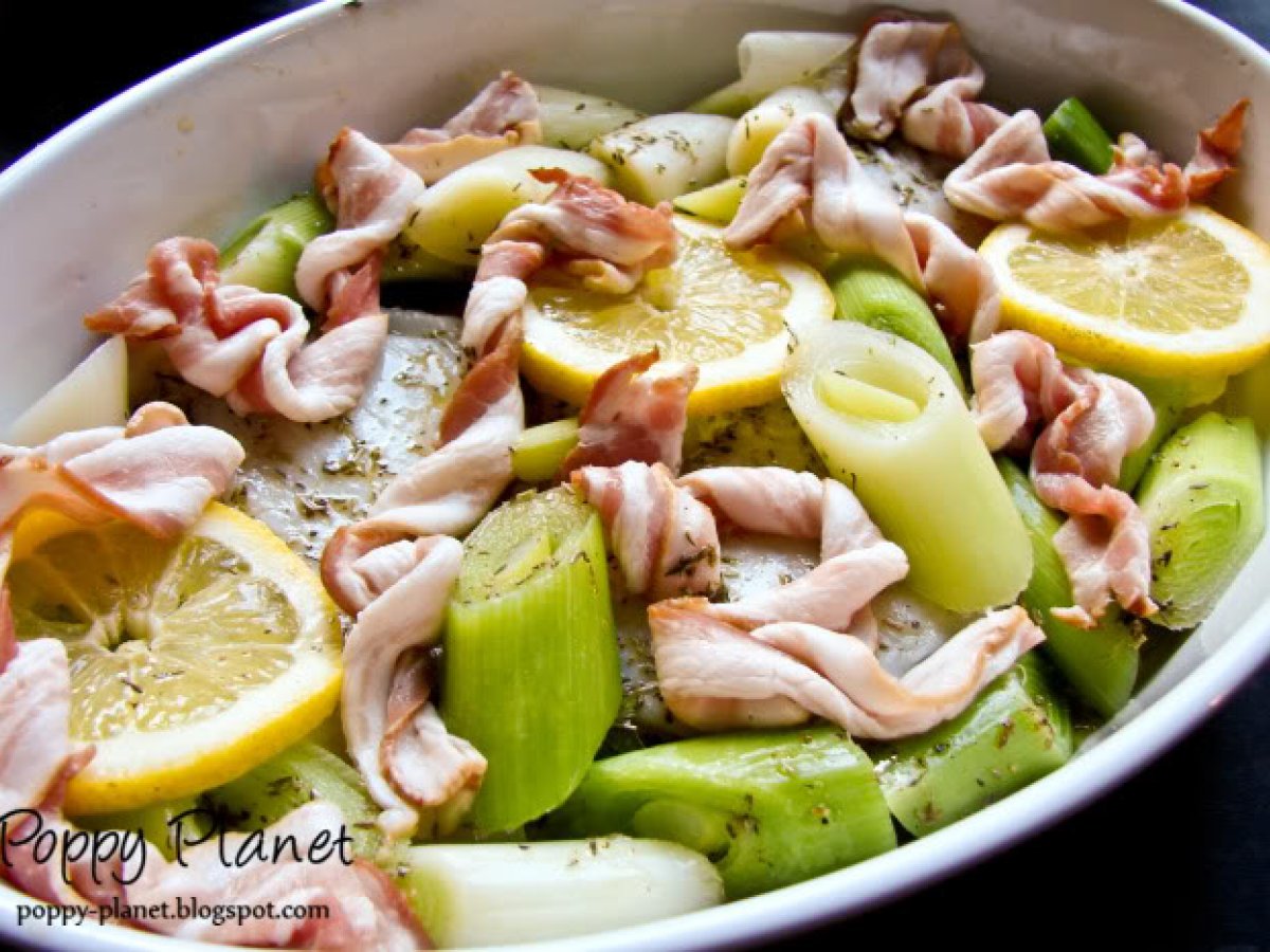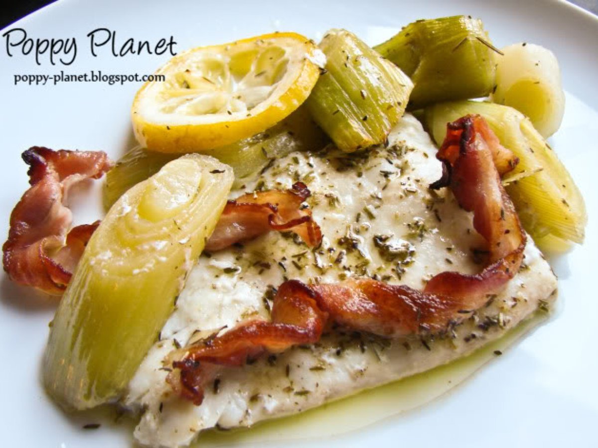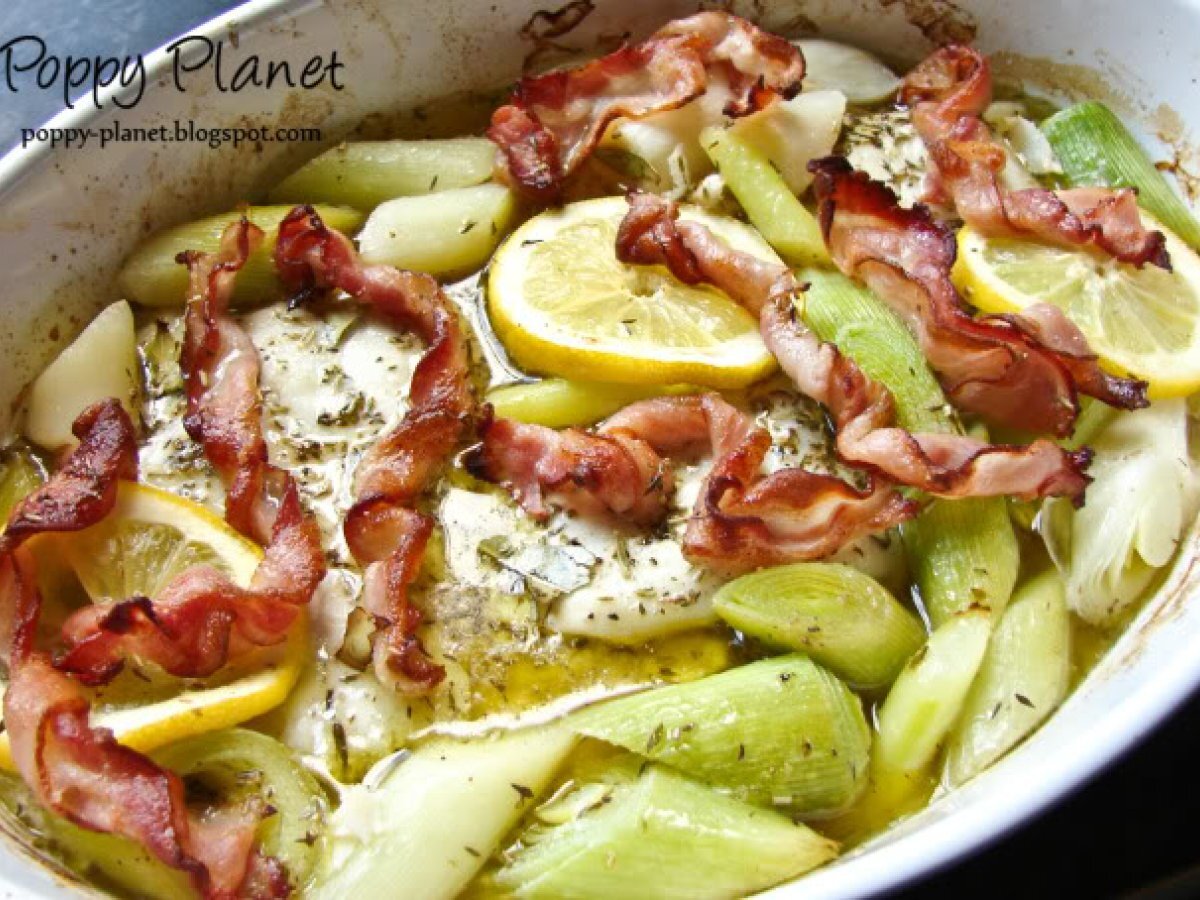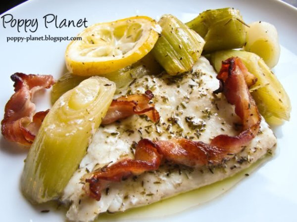 Cod cu praz si bacon a la jamie PrecedentulUrmătorul Felul principalFoarte ușor50 min Trimite unui prieten Printează pagina Adresează o întrebare autorului Postează o poză cu rețeta gătită de tine Ingrediente 4 3 fileuri de cod 3 fire praz 1 lamaie 140gr bacon 3 linguri ulei de masline rozmarin, cimbru si foi de dafin sare, piper