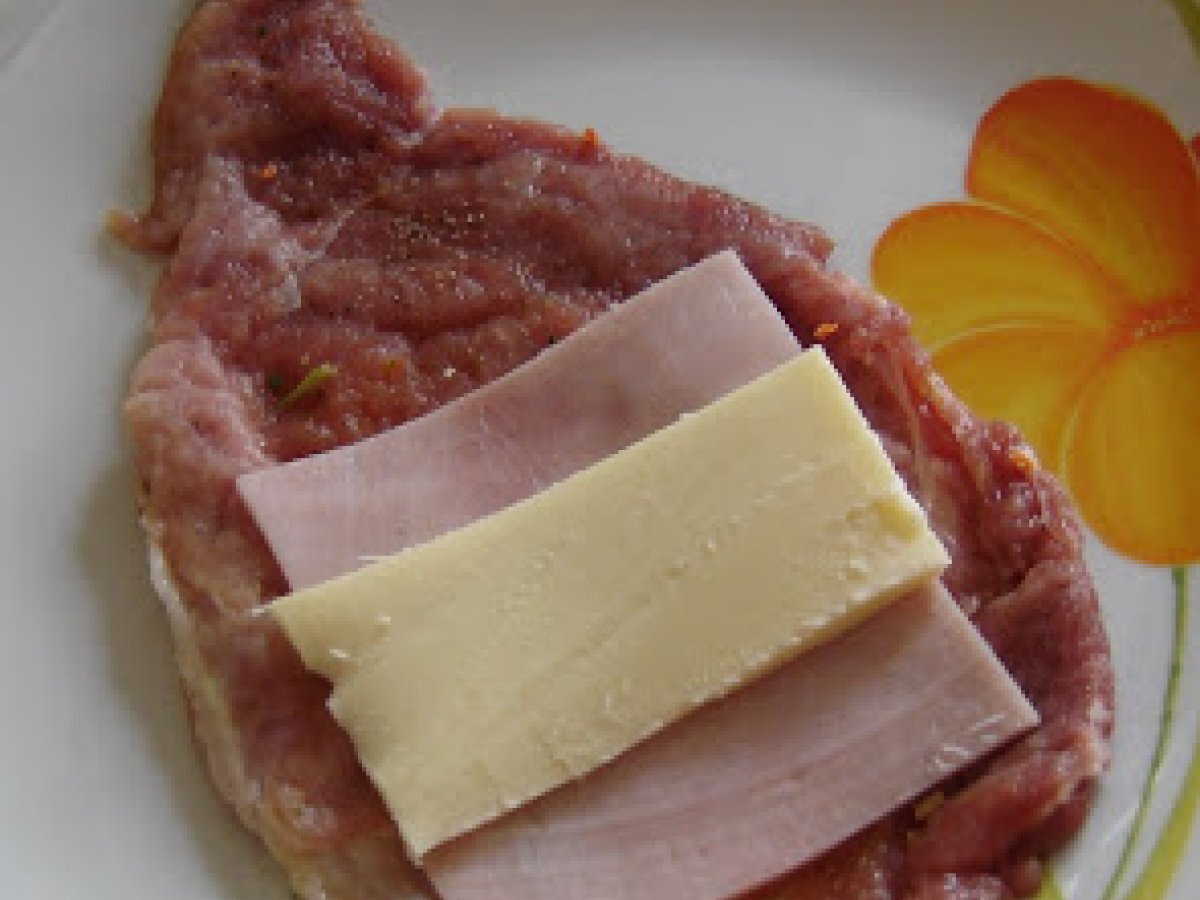 Cordon bleu de porc PrecedentulUrmătorul Felul principalFoarte ușor25 min Trimite unui prieten Printează pagina Adresează o întrebare autorului Postează o poză cu rețeta gătită de tine Ingrediente 4 6 felii de carne pentru snitel 6 felii cascaval 6 felii sunca condimente dupa bunul plac 2 oua , faina si pesmet.