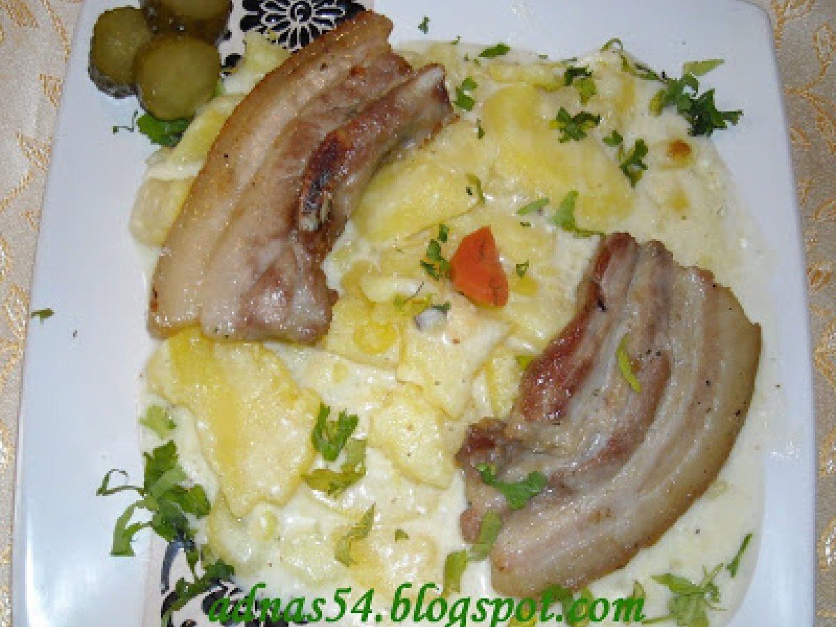 Costita cu cartofi in sos alb Felul principalFoarte ușor1 oră Trimite unui prieten Printează pagina Adresează o întrebare autorului Postează o poză cu rețeta gătită de tine Ingrediente 2 8 fasii de costita 7-8 cartofi 2 foi de dafin Sosul alb: 2 lg. de faina 50 g margarita lapte, smantana nucsoara sare, piper alb