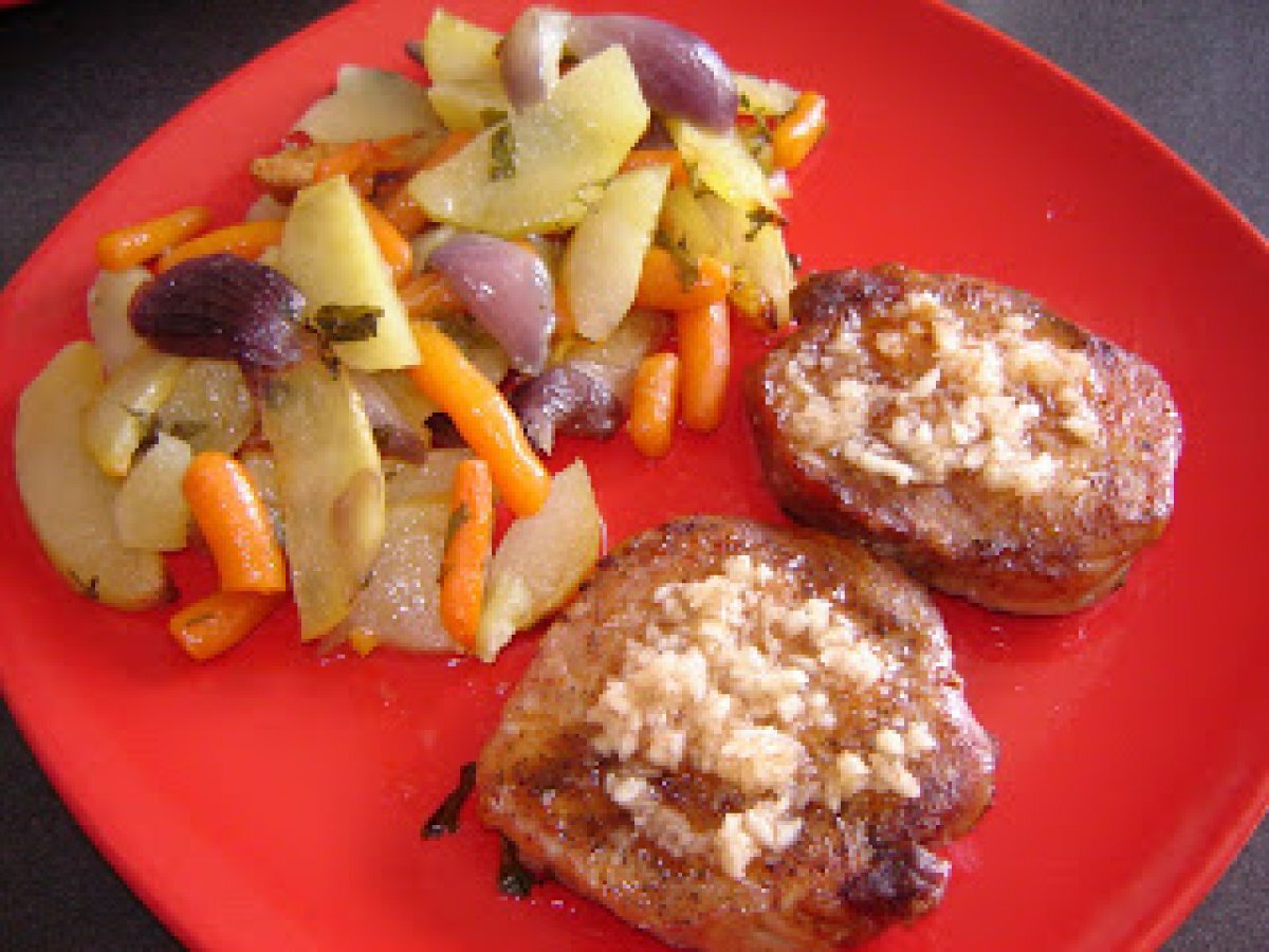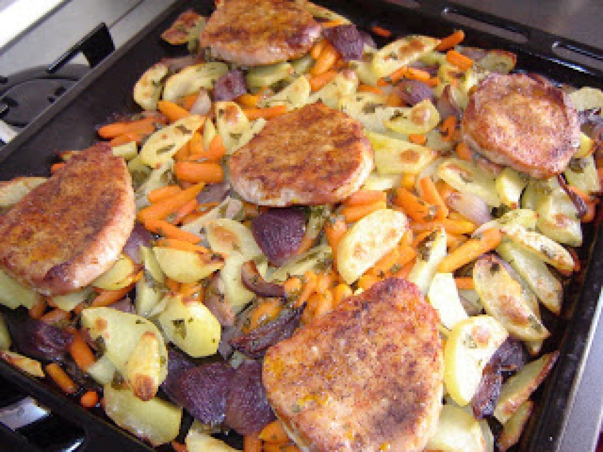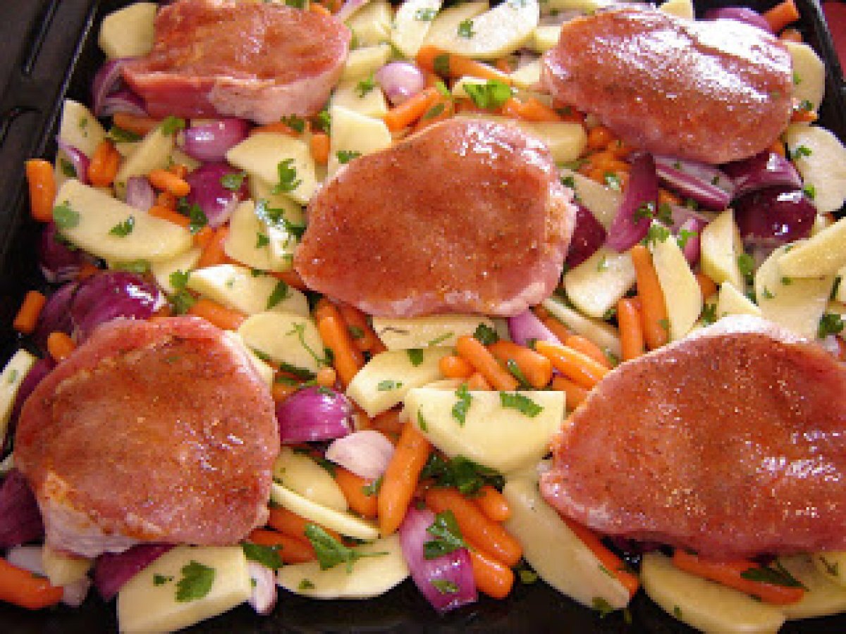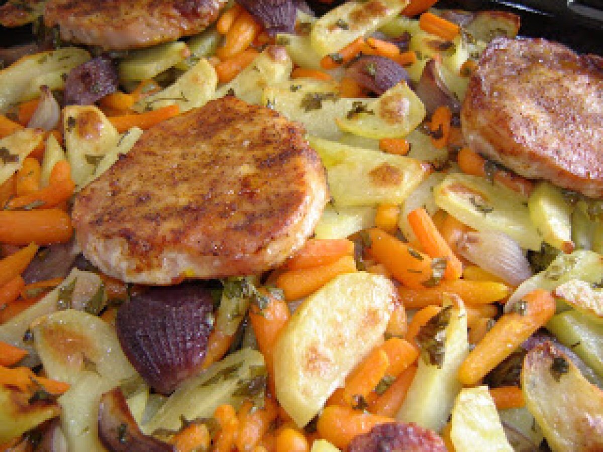 Cotlet de porc la cuptor pe pat de legume / baked pork chops on vegetable bed PrecedentulUrmătorul Felul principalFoarte ușor50 min Trimite unui prieten Printează pagina Adresează o întrebare autorului Postează o poză cu rețeta gătită de tine Ingrediente 2 6 cartofi 1 punga baby carrots congelati 3 cepe rosii mici 5 cotlete de porc fara os sare, piper, boia frunze de patrunjel ulei de masline