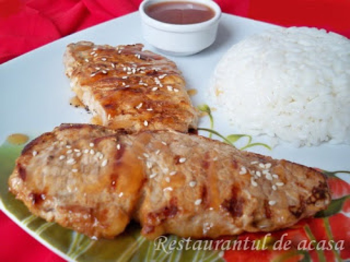Cotlet de porc la gratar (marinat in sos de soia) Felul principalFoarte ușor45 min Trimite unui prieten Printează pagina Adresează o întrebare autorului Postează o poză cu rețeta gătită de tine Ingrediente 4 4 felii cotlet de porc fara os , sos de soia , susan pentru decor , ulei .