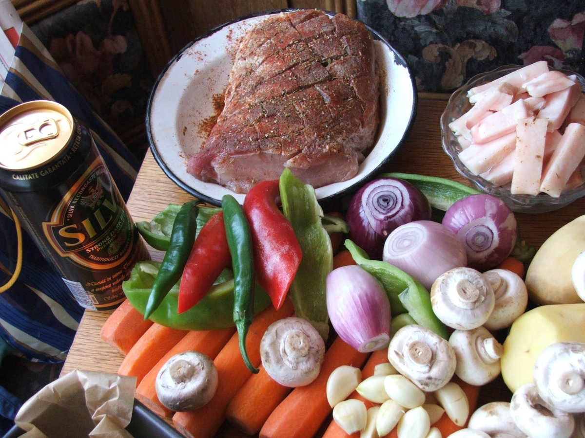 Cotlet de porc la tava pe pat de legume PrecedentulUrmătorul Felul principalUșor3 h 30 m Trimite unui prieten Printează pagina Adresează o întrebare autorului Postează o poză cu rețeta gătită de tine Ingrediente 6 cotlet porc fara os 1kg slanina cruda 200g cartofi 1kg morcovi 500g cepe 4 buc usturoi o capatana ardei kapia rosu si verde cate o bucata ardei iute 1-2 buc sare,piper,boia iute,oregano dupa gust ciuperci 500g bere neagra o cutie de 500 ml