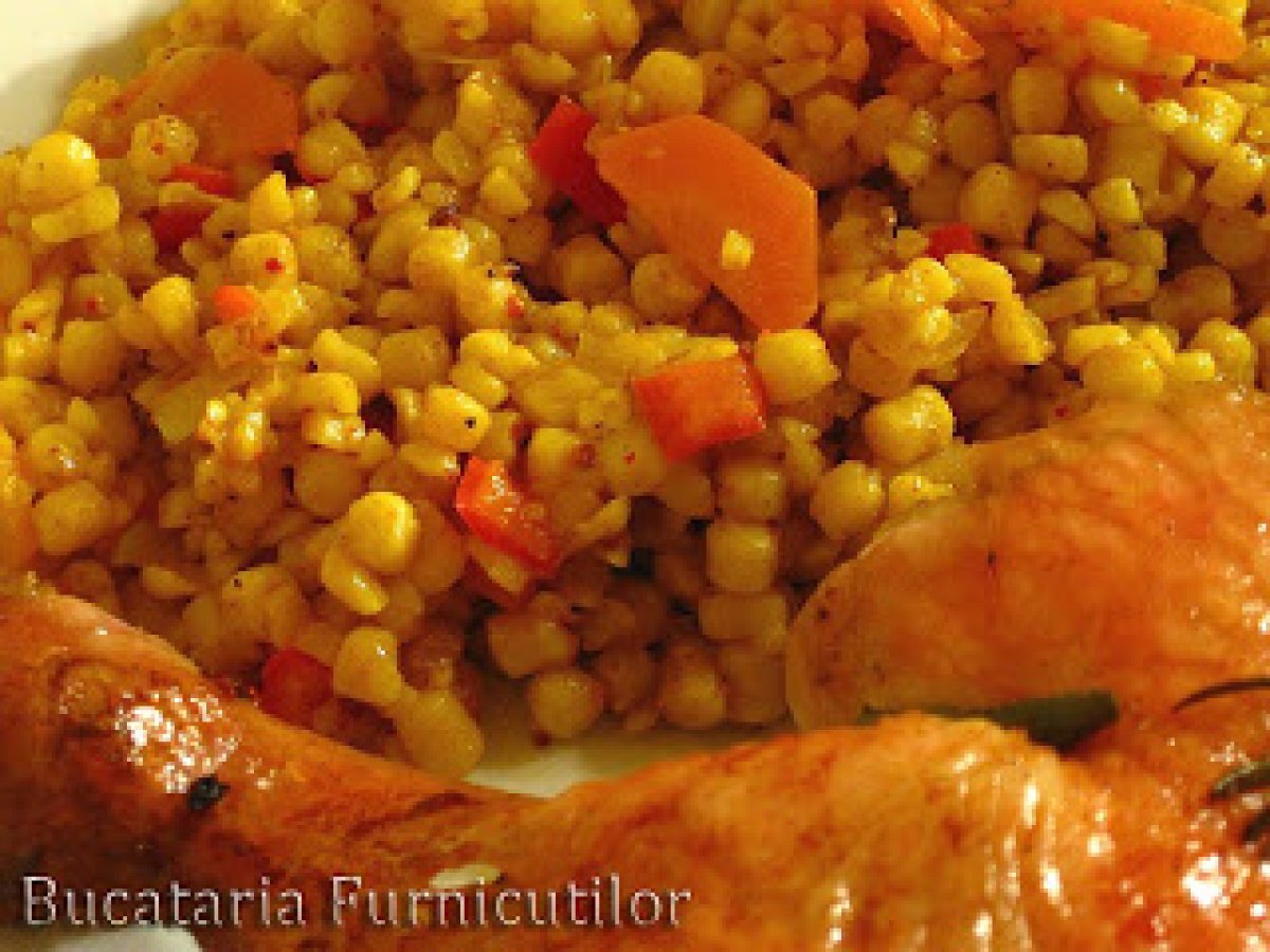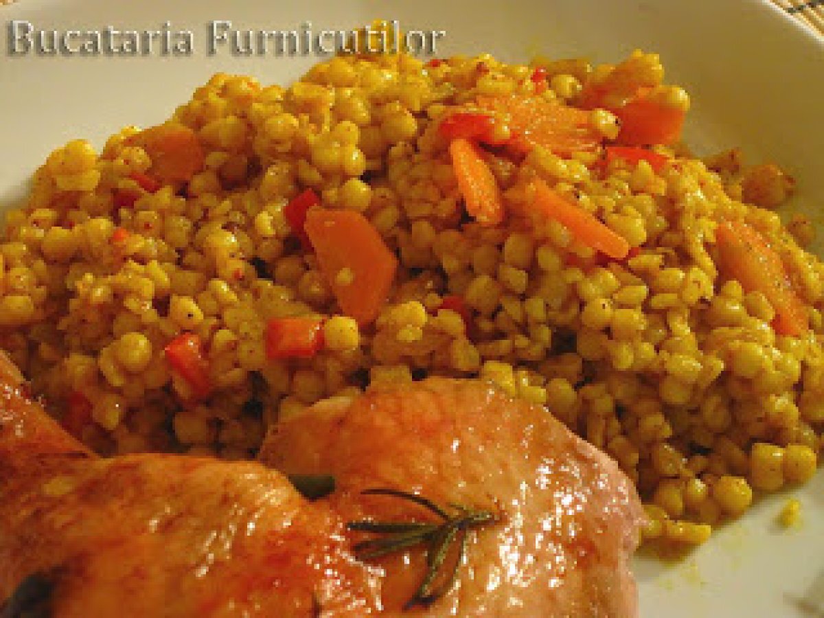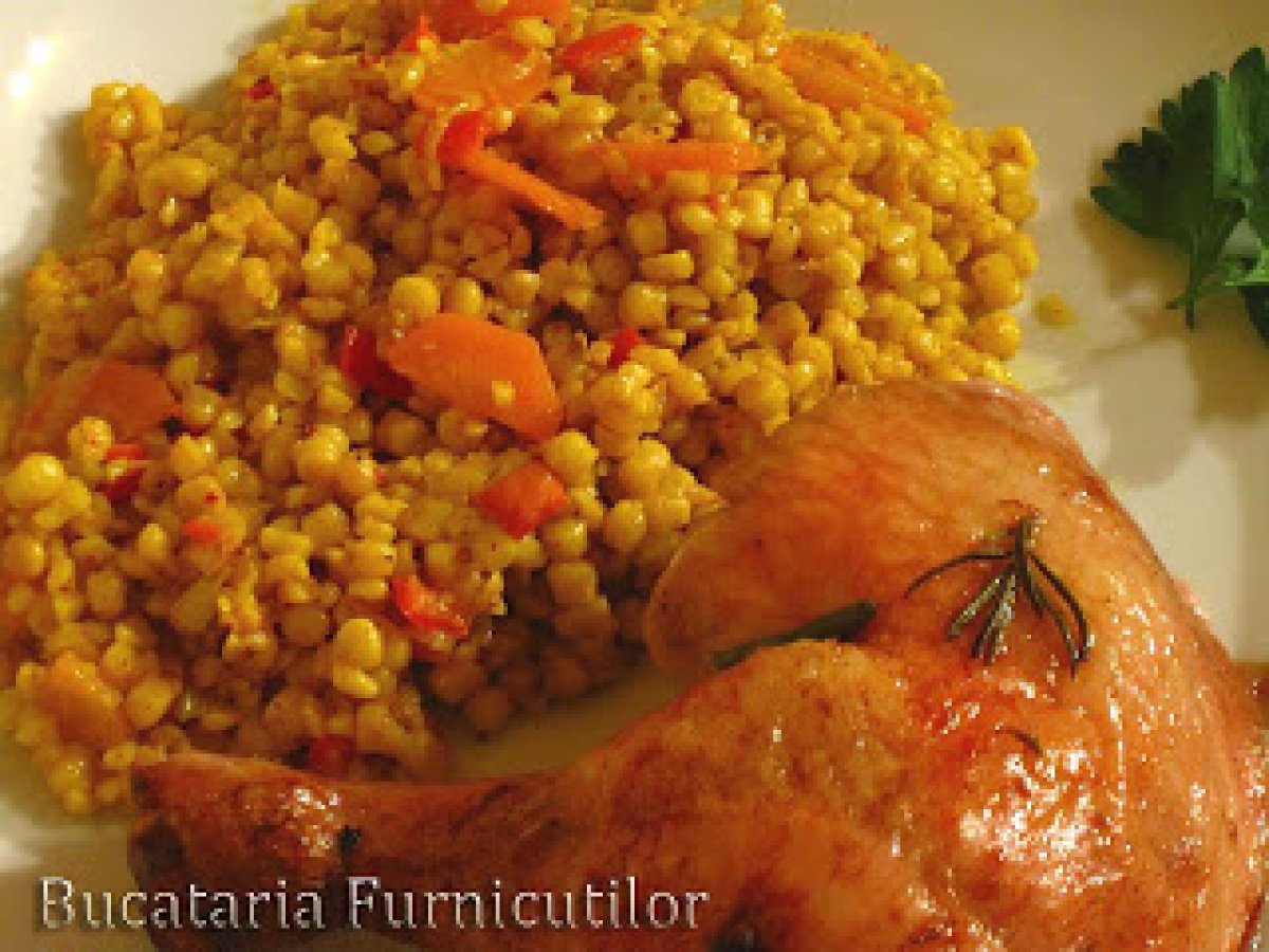 Cous cous cu legume PrecedentulUrmătorul Felul principalFoarte ușor35 min Trimite unui prieten Printează pagina Adresează o întrebare autorului Postează o poză cu rețeta gătită de tine Ingrediente 6 200 g cous cous uscat 1 dovlecel 1 ardei capia 1 ceapa 1 morcov 400 ml supa de pui 1 lingurita boia 1 lingurita praf de sofran jumatate lingurita nucoara macinata jumatate lingurita chimen macinat sare, piper 2 - 3 linguri ulei pentru calit