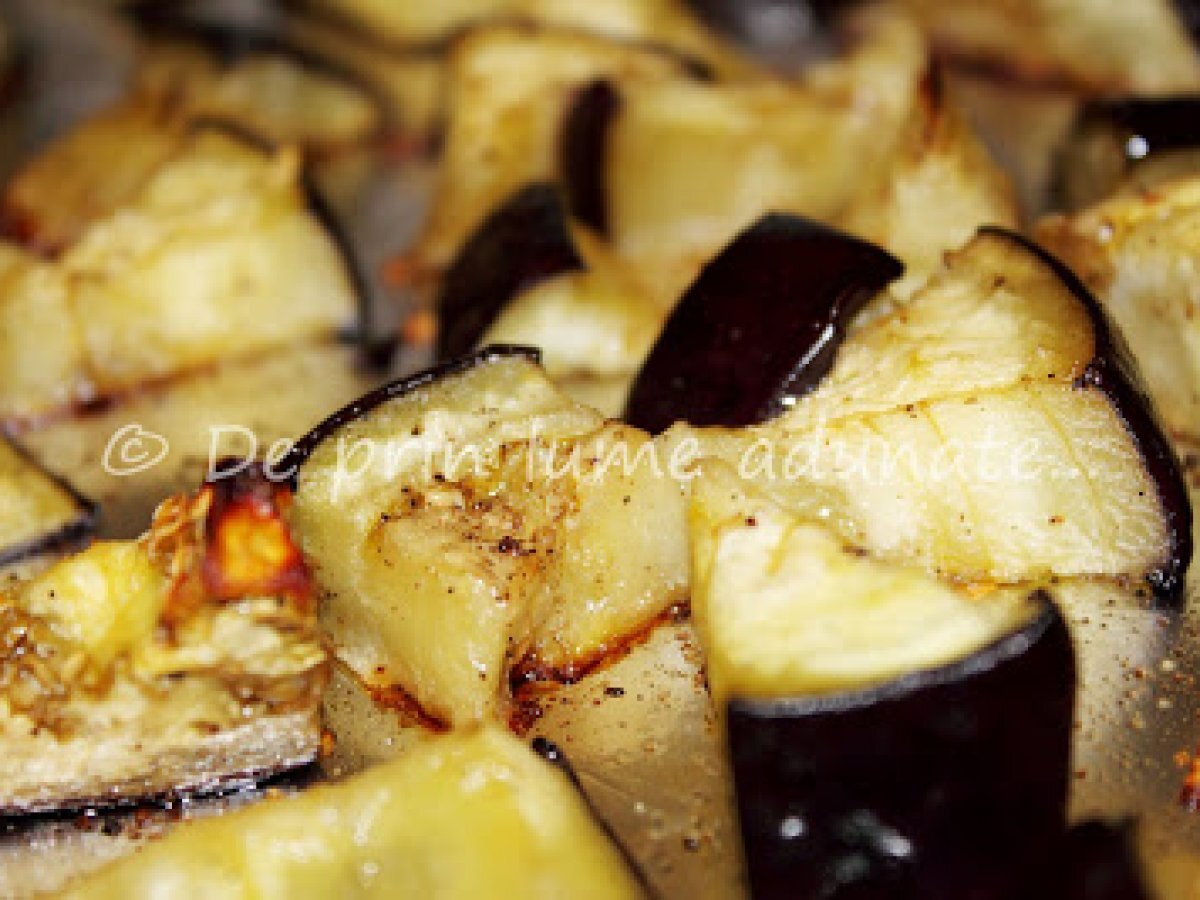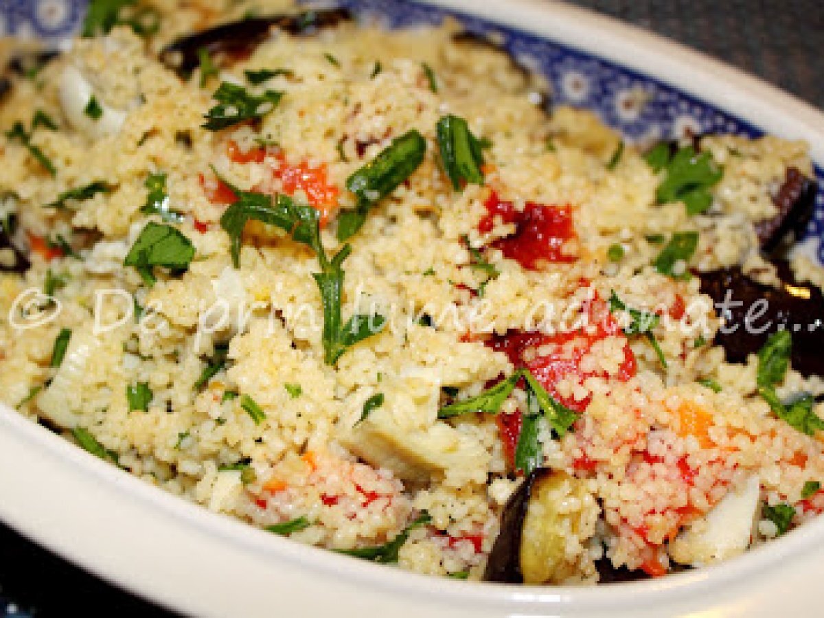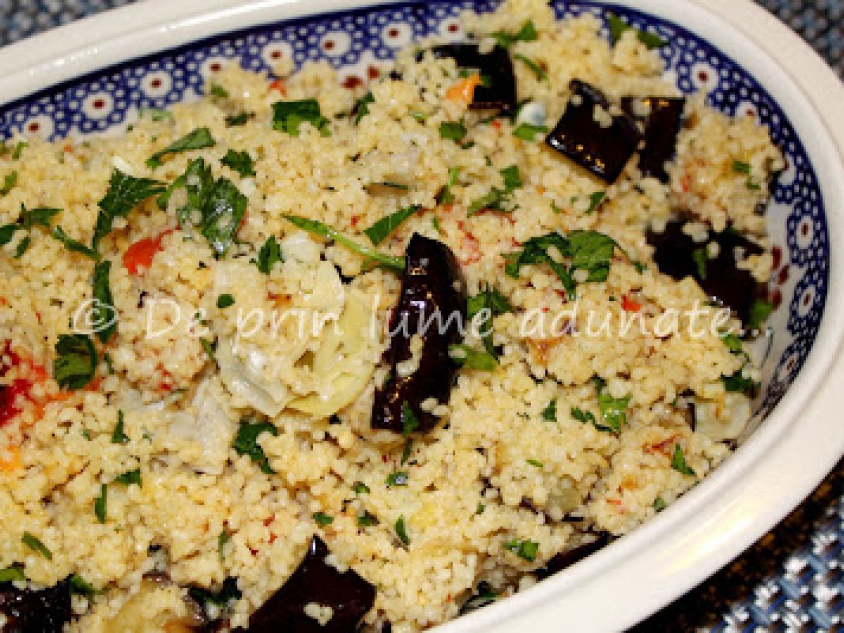 Couscous cu vinete si ardei copti PrecedentulUrmătorul Felul principalFoarte ușor45 min Trimite unui prieten Printează pagina Adresează o întrebare autorului Postează o poză cu rețeta gătită de tine Ingrediente 6 1 cana couscous 1 cana apa fiarta 1 vanata mare 1 ardei rosu gras mare 1/2 cana anghinare marinata din borcan 3-4 linguri patrunjel tocat 1 lamaie, coaja rasa si zeama 1 lingurita chimen pudra sare si piper dupa gust 3-4 linguri ulei de masline extra virgin