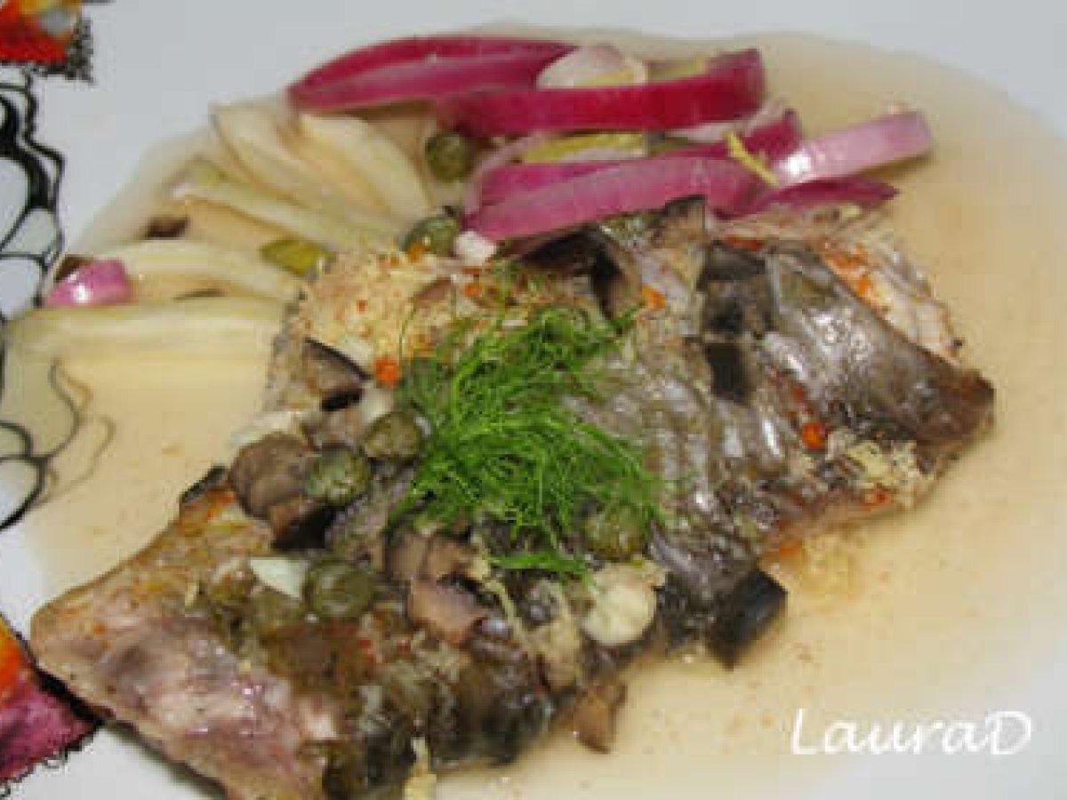 Crap in vin cu fenicul, capere si masline negre Felul principalUșor35 min Trimite unui prieten Printează pagina Adresează o întrebare autorului Postează o poză cu rețeta gătită de tine Ingrediente 4 1 bulb de fenicul, curat si tocat fin (frunzele se pot pastra pentru ornare) 1 ceapa rosie, tocata 4 fileuri de crap (aprox.125 gr fiecare) sare si piepr negru coaja rasa si sucul de la 1 lamaie 2 linguri capere 1 catel de usuroi, tocat marunt 6 masline negre, fara samburi, tocate marunt 1 praf de boia 150 ml vin alb sec
