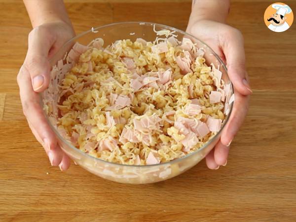 Fierbeti pastele in timpul indicat pe ambalaj, apoi scurgeti-le. Adaugati cascaval ras si sunca presata taiata in bucati mici si amestecati.