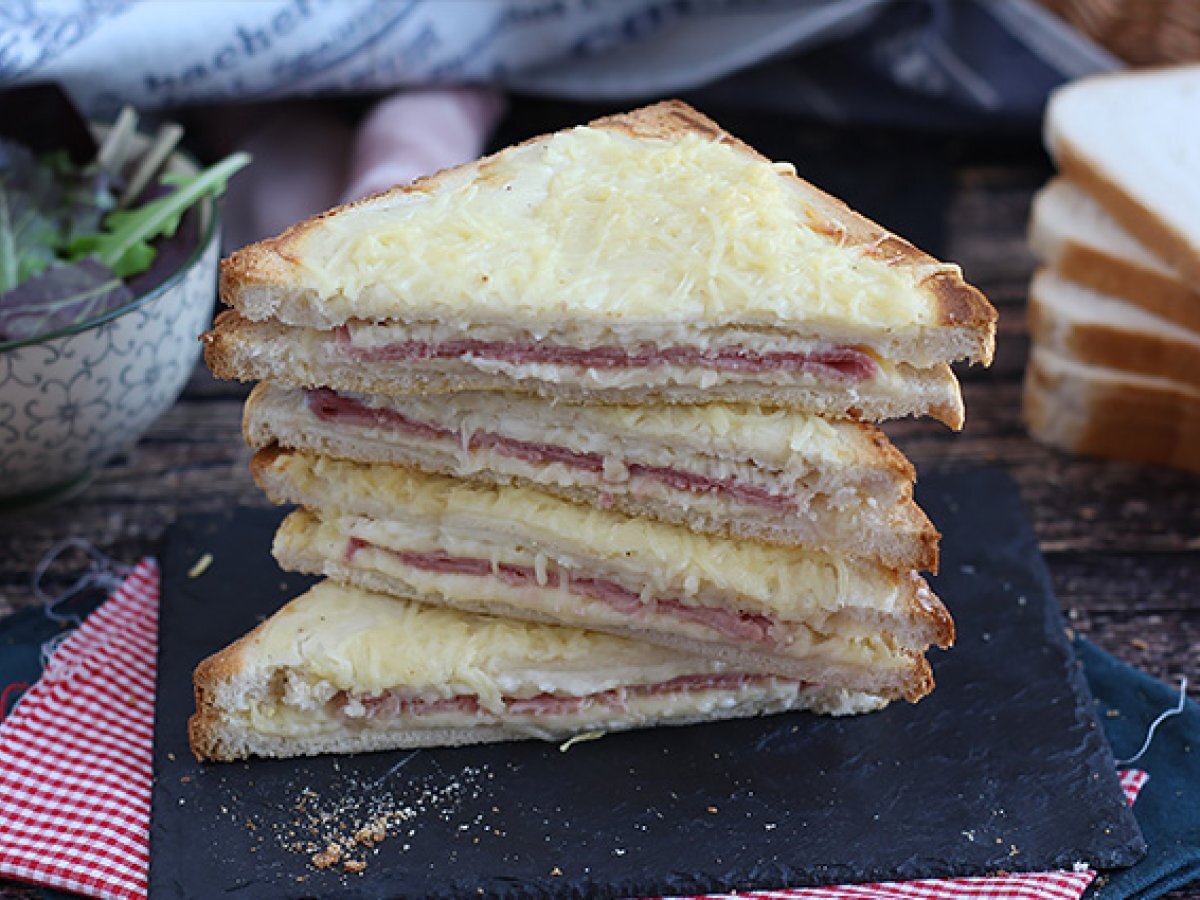 Toata familia adora croque-monsieur! Usor si rapid acest preparat insotit de o salata mixta nu va necesita multe ingrediente ;-) Pentru a-l face irezistibil, adaugati un pic de bechamel si cascaval ras. Reteta pas cu pas in videoclipul nostru si in reteta scrisa.
