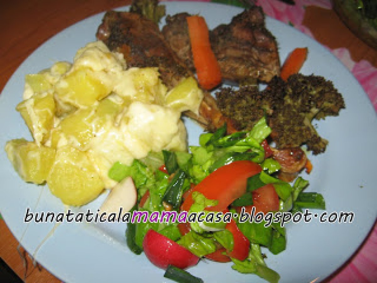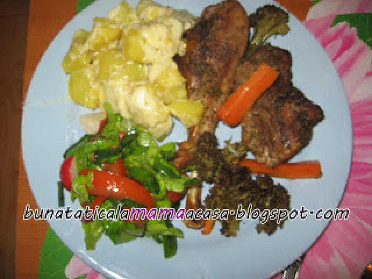 Curcan la cuptor cu cartofi si cascaval PrecedentulUrmătorul Felul principalFoarte ușor35 min Trimite unui prieten Printează pagina Adresează o întrebare autorului Postează o poză cu rețeta gătită de tine Ingrediente 4 Pulpe de curcan morcov brocoli cartofi cascaval sos de soya codimente