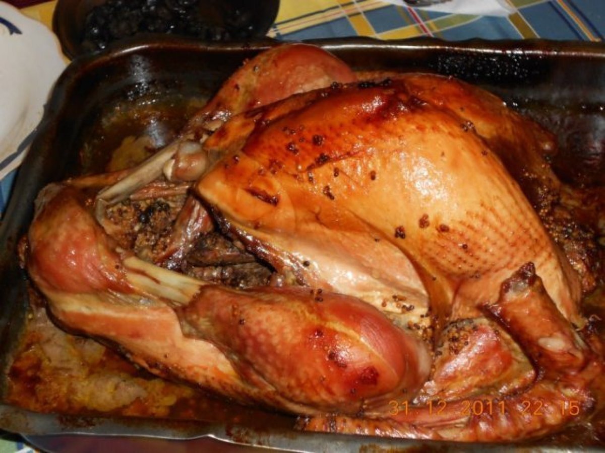 Acest simpatic curcan a facut Revelionul 2012 cu noi si am zis sa il bronzam un pic ca sa fie fotogenic,asa ca a stat ceva vreme in cuptor ca sa ajunga la performanta asta de a arata atat de apetisant:) Inainte de sedinta de bronz,micutul a facut baie intr-un bait delicios pentru o zi si jumatate,timp in care (ca sa nu amorteasca) l-am mai intors de pe o parte pe alta ca sa fie bine baituit si uniform .