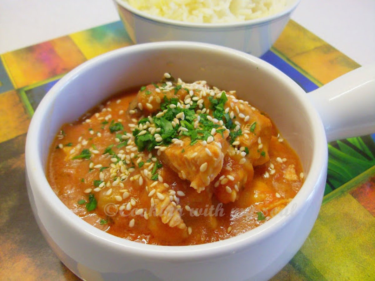 Curry de pui cu rosii in lapte de cocos (chicken and tomatoes curry in coconut milk) Felul principalFoarte ușor40 min Trimite unui prieten Printează pagina Adresează o întrebare autorului Postează o poză cu rețeta gătită de tine Ingrediente 4 4 linguri ulei de porumb 150 g piept de pui fara os si piele 1 ceapa 3 catei de usturoi, rasi 7 frunze de curry uscate 1 cutie mare de rosii in bulion 1/2 lingurita de chimion praf 1 lingurita coriandru praf 1 lingurita sare 1/2 lingurita chilli praf 150 -200 ml lapte de cocos 1 lingura amidon de porumb 1 lingura seminte de susan, prajite uscat 1 lingurita patrunjel tocat garnitura de orez basmati