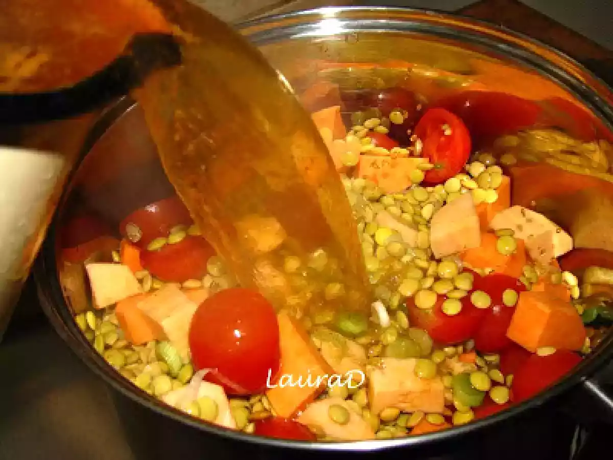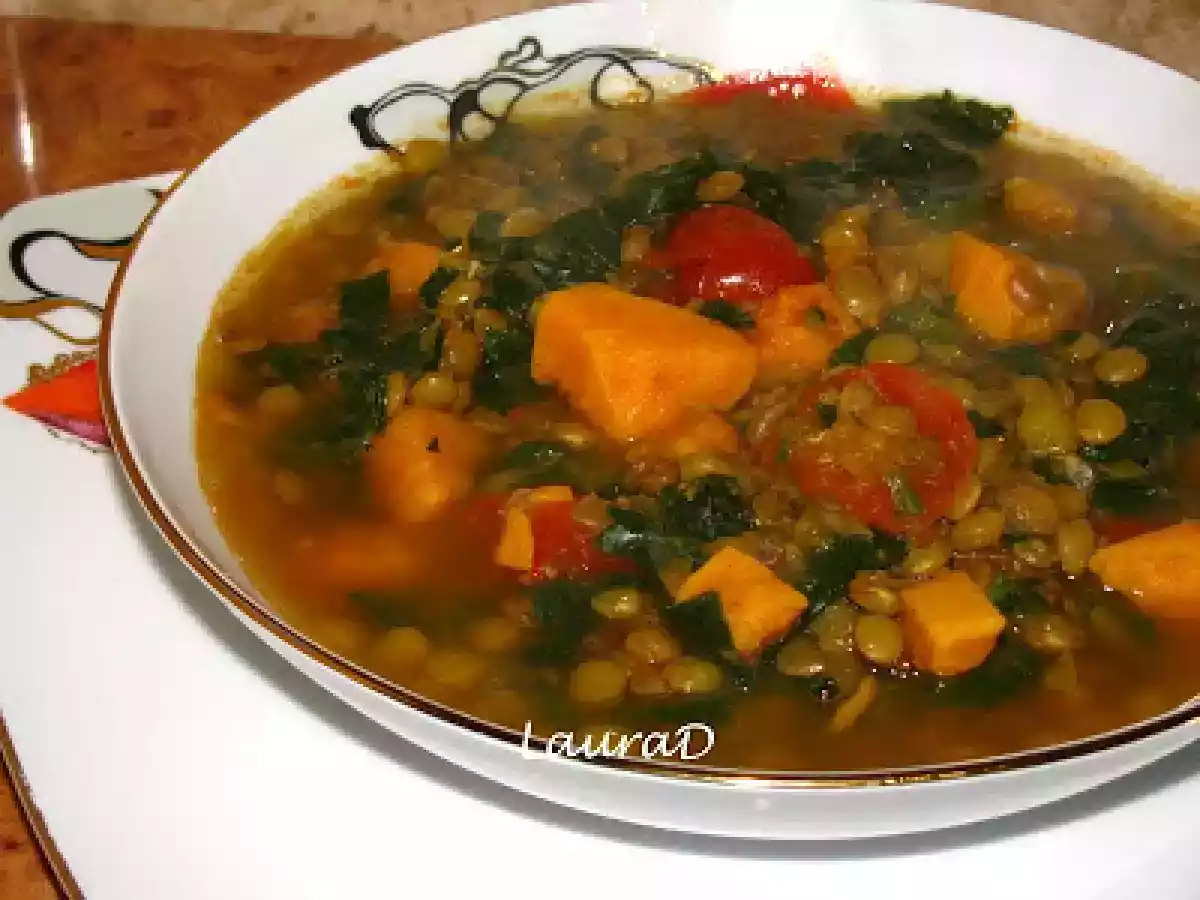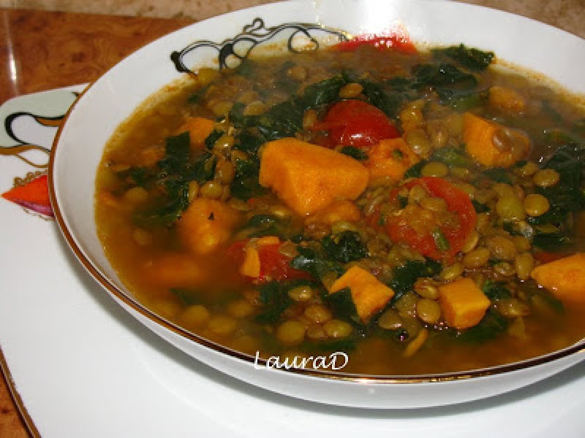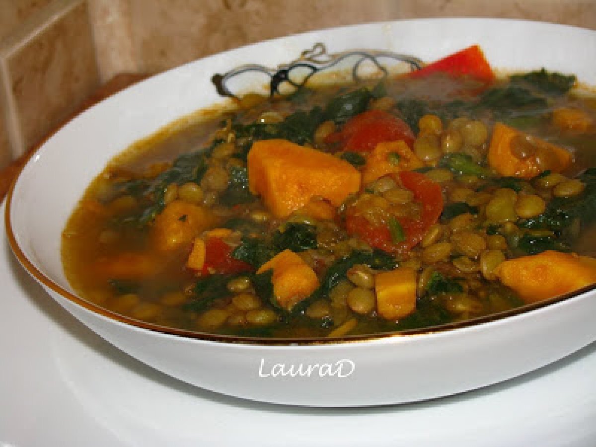 Dahl cu cartofi dulci, spanac si linte verde PrecedentulUrmătorul Felul principalFoarte ușor1 oră Trimite unui prieten Printează pagina Adresează o întrebare autorului Postează o poză cu rețeta gătită de tine Ingrediente 4 200 g linte verde 900 ml zeama de supa de legume 2 cepe verzi, tocate 400 g rosii cherry 1 lingurita praf de curry 2 lingurite garam masala 1 lingurita chilli 1 lingurita boia de ardei dulce 2 cartofi dulci, curatati si taiati cubulete 400 g frunze proaspete de spanac, spalate si taiate fasii