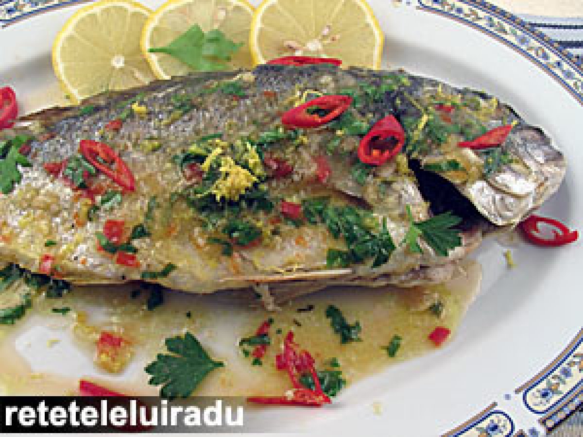 Dorada cu sos de lamaie Felul principalFoarte ușor25 min Trimite unui prieten Printează pagina Adresează o întrebare autorului Postează o poză cu rețeta gătită de tine Ingrediente 2 2 dorade, circa 800 g in total sare piper negru, proaspat macinat 1 lamaie 1 ardei iute rosu 1 catel de usturoi 2-3 linguri de ulei de masline extra virgin 1 lingurita de zahar 3-4 fire de patrunjel proaspat, tocate cateva felii de lamaie, pentru ornat frunze proaspete de patrunjel