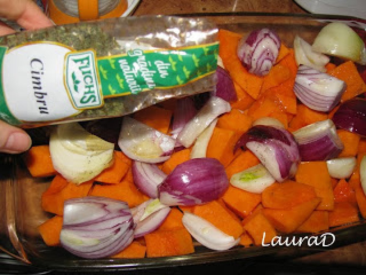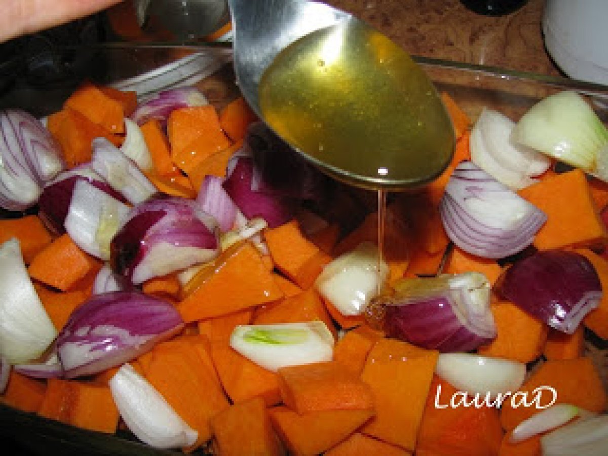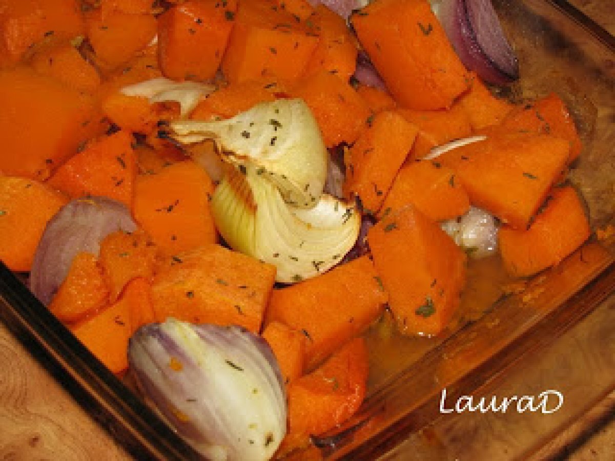 Dovleac copt cu sferturi de ceapa PrecedentulUrmătorul Felul principalFoarte ușor40 min Trimite unui prieten Printează pagina Adresează o întrebare autorului Postează o poză cu rețeta gătită de tine Ingrediente 4 900 g dovlec pentru placinta, curatat si taiat cubulete 3 cepe rosii, curatate si taiate in sferturi 1 ceapa alba, curatata si taiata in sferturi 1 lingurita ulei de masline 2 linguri miere 2 lingurite cimbru maruntit sare si piper negru