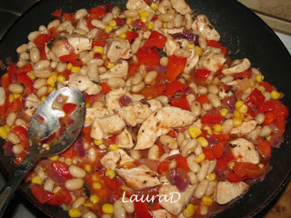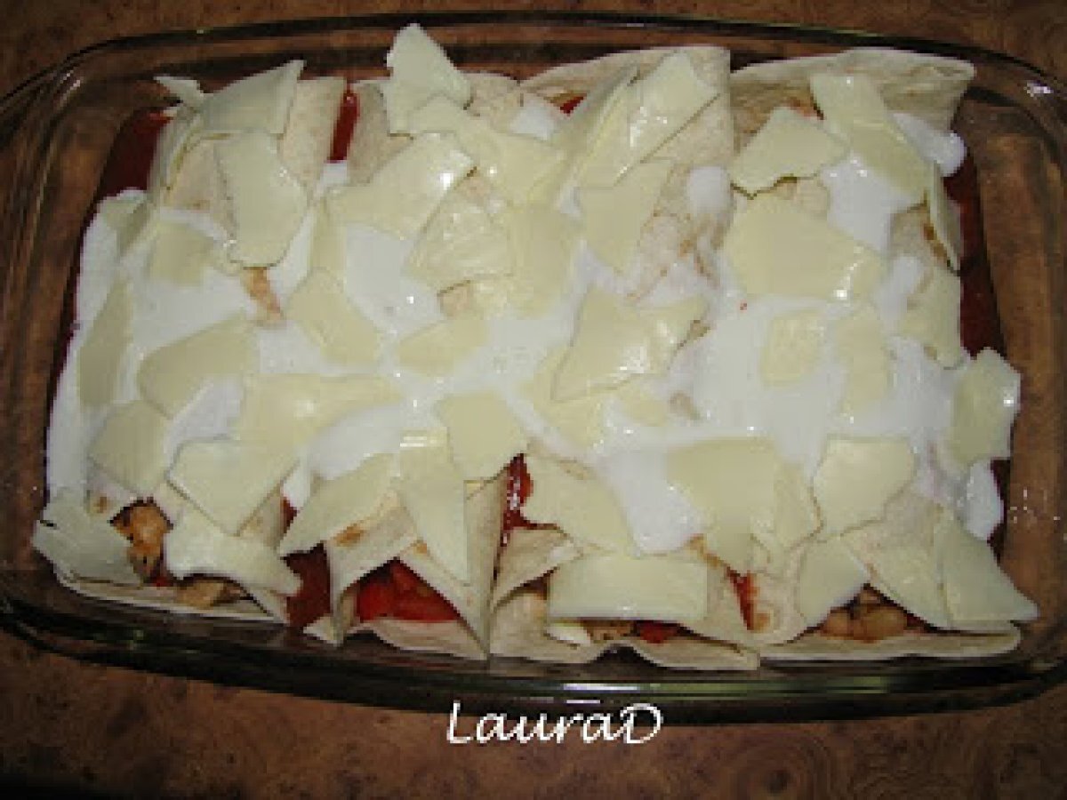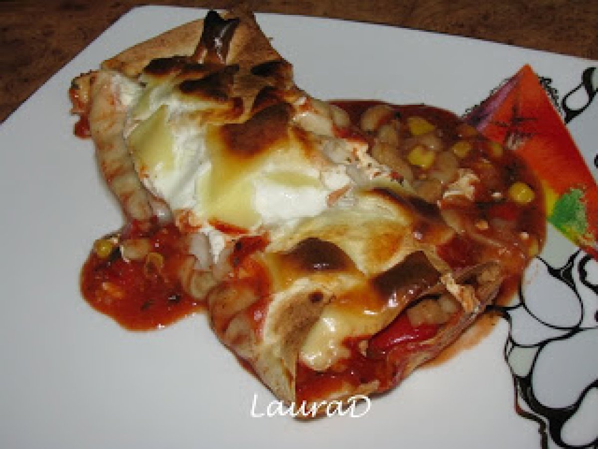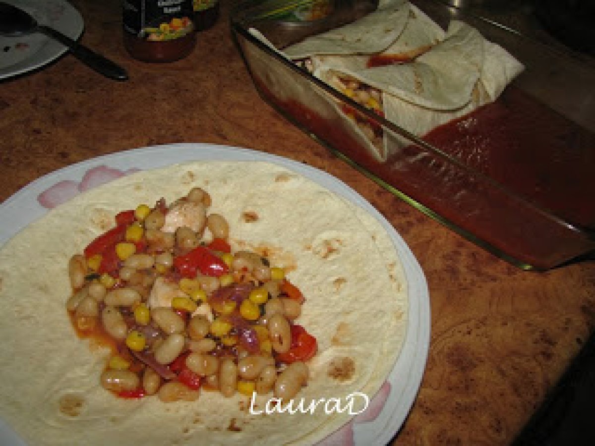 Enchiladas cu pui, fasole si porumb PrecedentulUrmătorul Felul principalFoarte ușor50 min Trimite unui prieten Printează pagina Adresează o întrebare autorului Postează o poză cu rețeta gătită de tine Ingrediente 4 2 linguri ulei de masline 1 ceapa rosie, tocata 1 ardei gras rosu, tocat 1 ardei iute uscat, maruntit 3 lingurite busuioc tocat 2 lingurite seminte de cumin 2 catei de usturoi, zdrobiti 250 g piept de pui, fara pielita, taiati cubulete 1 conserva (400 gr) fasole alba 100 g porumb din conserva, scurs 350 ml pasta de tomate 1 lingurita zahar 4 foi de tortillas, incalzite in cuptorul cu microunde timp de 1 minut 100 g smantana 100 g cascaval ras