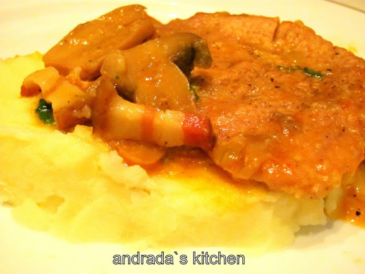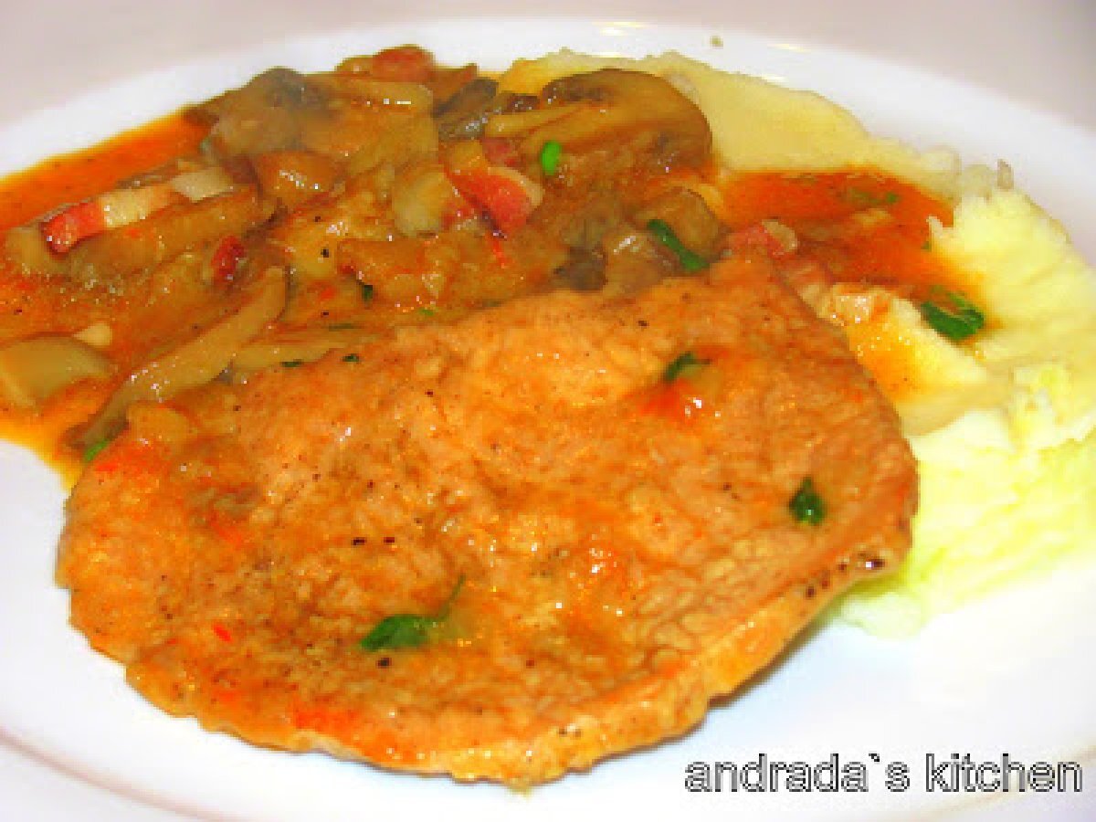 Escalop de porc cu ciuperci si ceapa PrecedentulUrmătorul Felul principalFoarte ușor45 min Trimite unui prieten Printează pagina Adresează o întrebare autorului Postează o poză cu rețeta gătită de tine Ingrediente 6 1 kg cotlet porc 3 cepe 1 cutie ciperci 100 ml vin alb 100 g kaizer 2 linguri bulion 1 lingura unt patrunjel frunze ulei faina sare