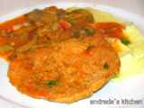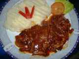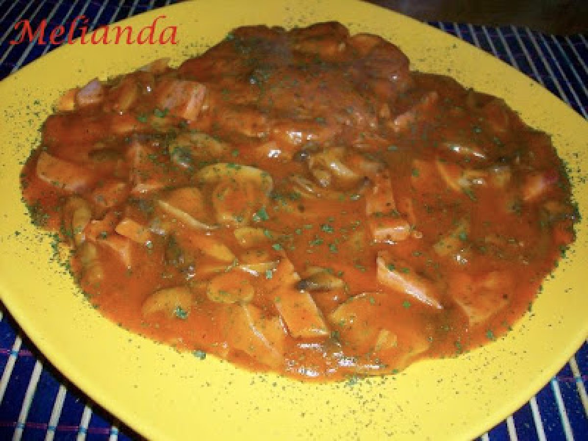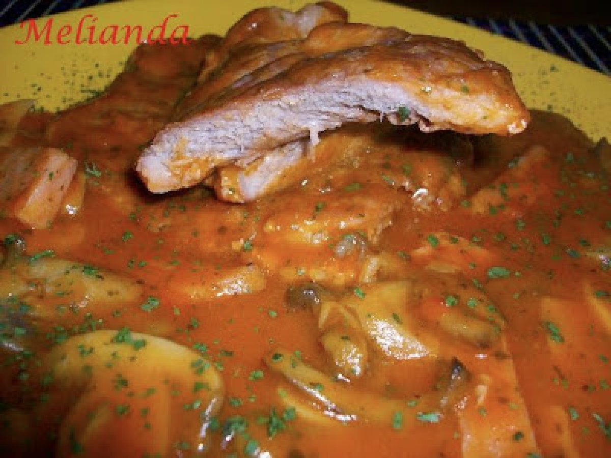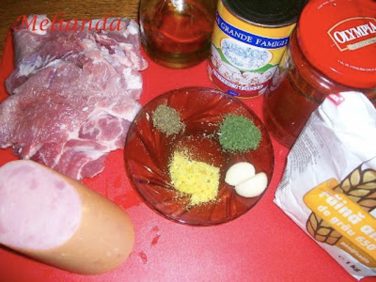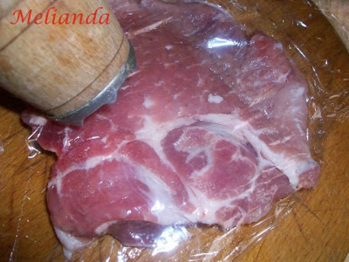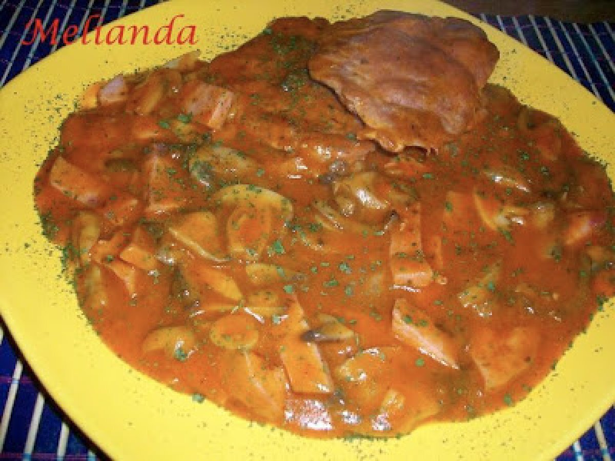 Escalop zingara PrecedentulUrmătorul Felul principalFoarte ușor27 min Trimite unui prieten Printează pagina Adresează o întrebare autorului Postează o poză cu rețeta gătită de tine Ingrediente 4 600 g pulpa de porc 150 g sunca presata 200 g ciuperci ulei de masline o lingura cu faina 1-2 linguri cu bulion sare ,piper o legatura patrunjel 1-2 catei de usturoi