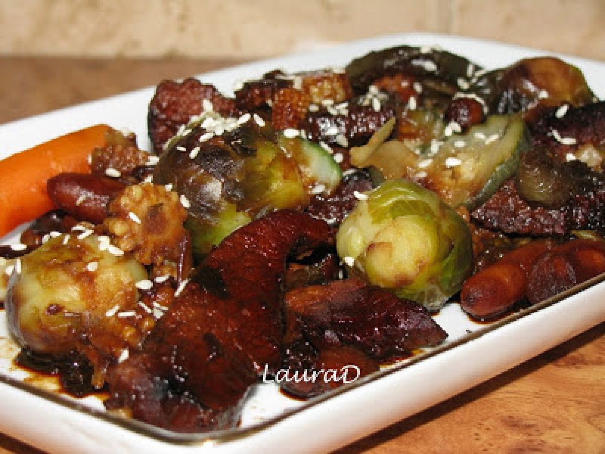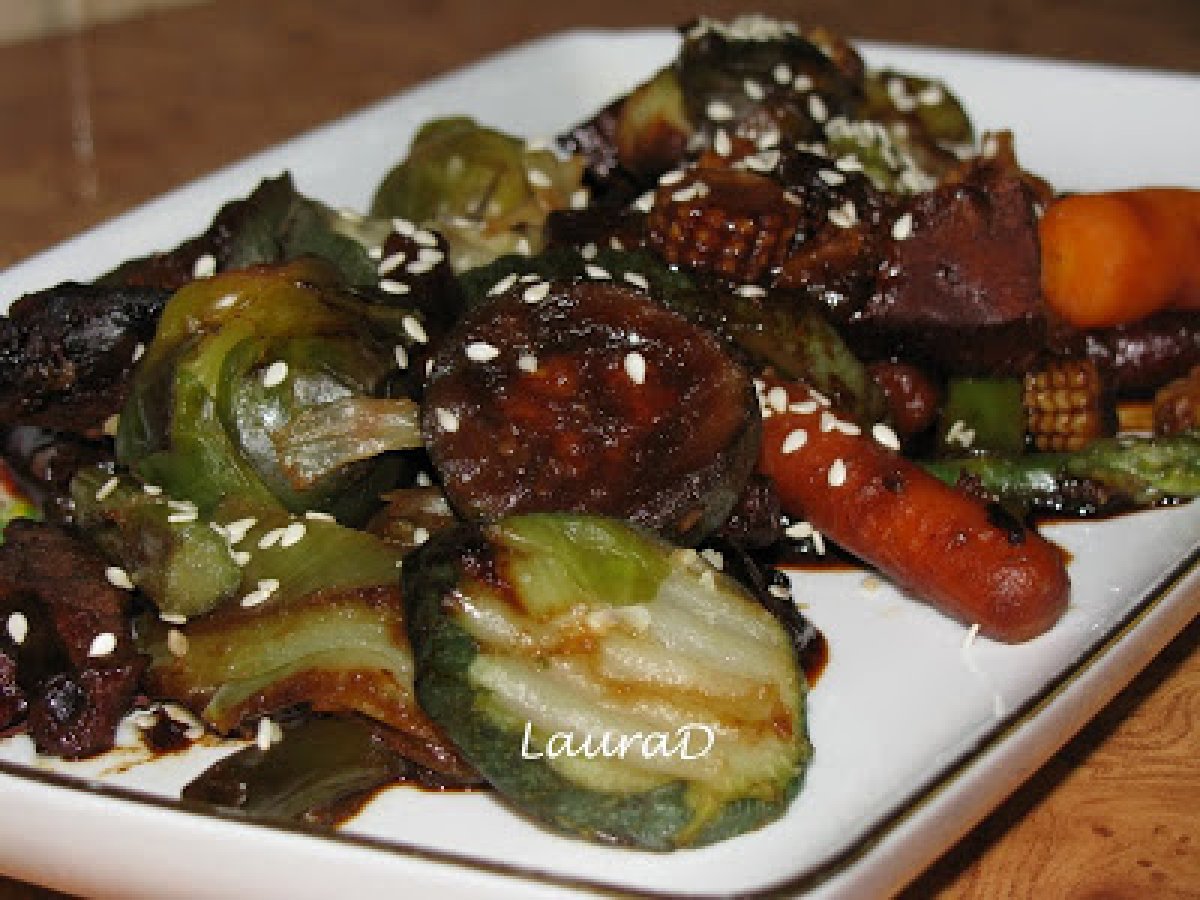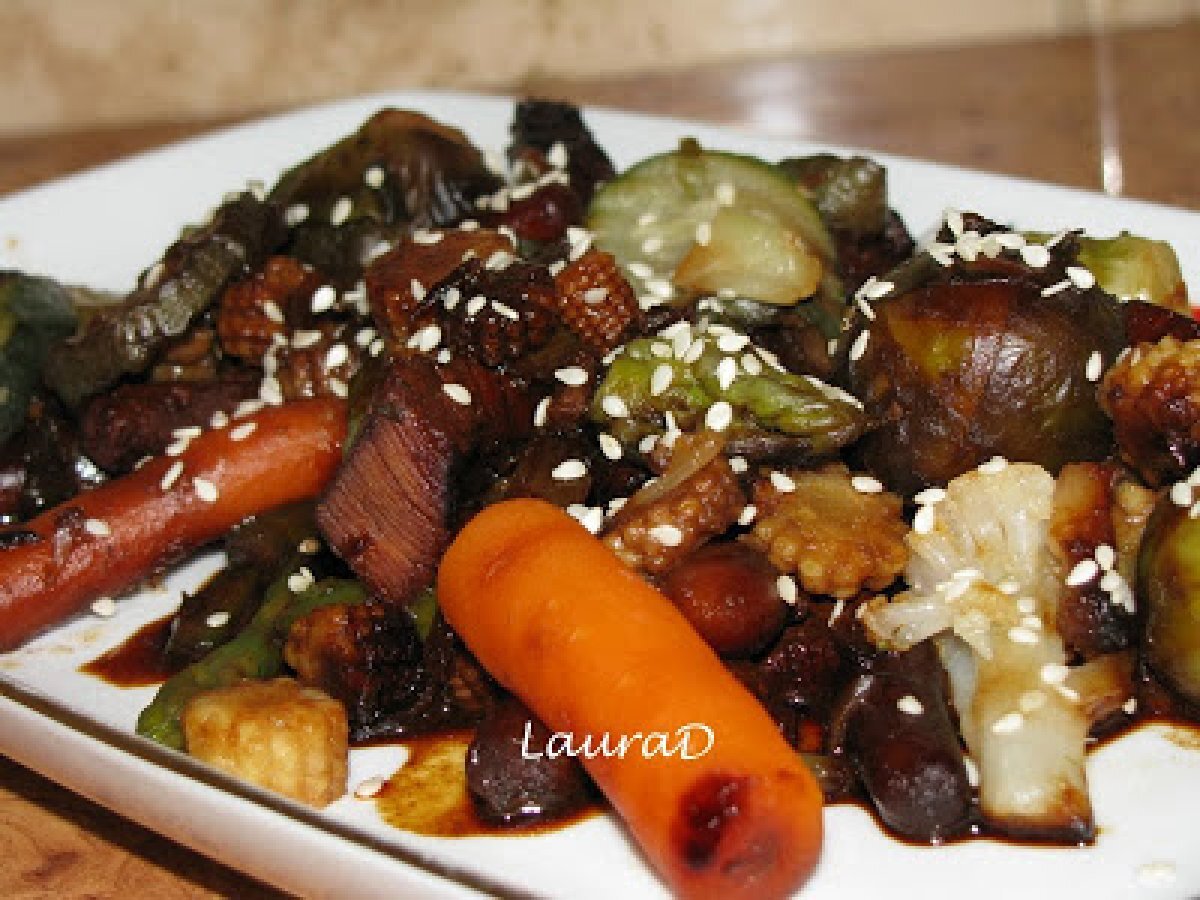Fasii de vita cu legume si sos dulce-acrisor PrecedentulUrmătorul Felul principalFoarte ușor45 min Trimite unui prieten Printează pagina Adresează o întrebare autorului Postează o poză cu rețeta gătită de tine Ingrediente 6 500 g muschi de vita, taiat fasii 4 linguri Ketchup 2 linguri miere 2 linguri otet balsamic 1 lingura sos de soia 1 lingura Sweet&Sour Sauce 1 lingurita zahar brun 2-3 linguri ulei 750 g mix de legume congelate, decongelate 25 g seminte de susan