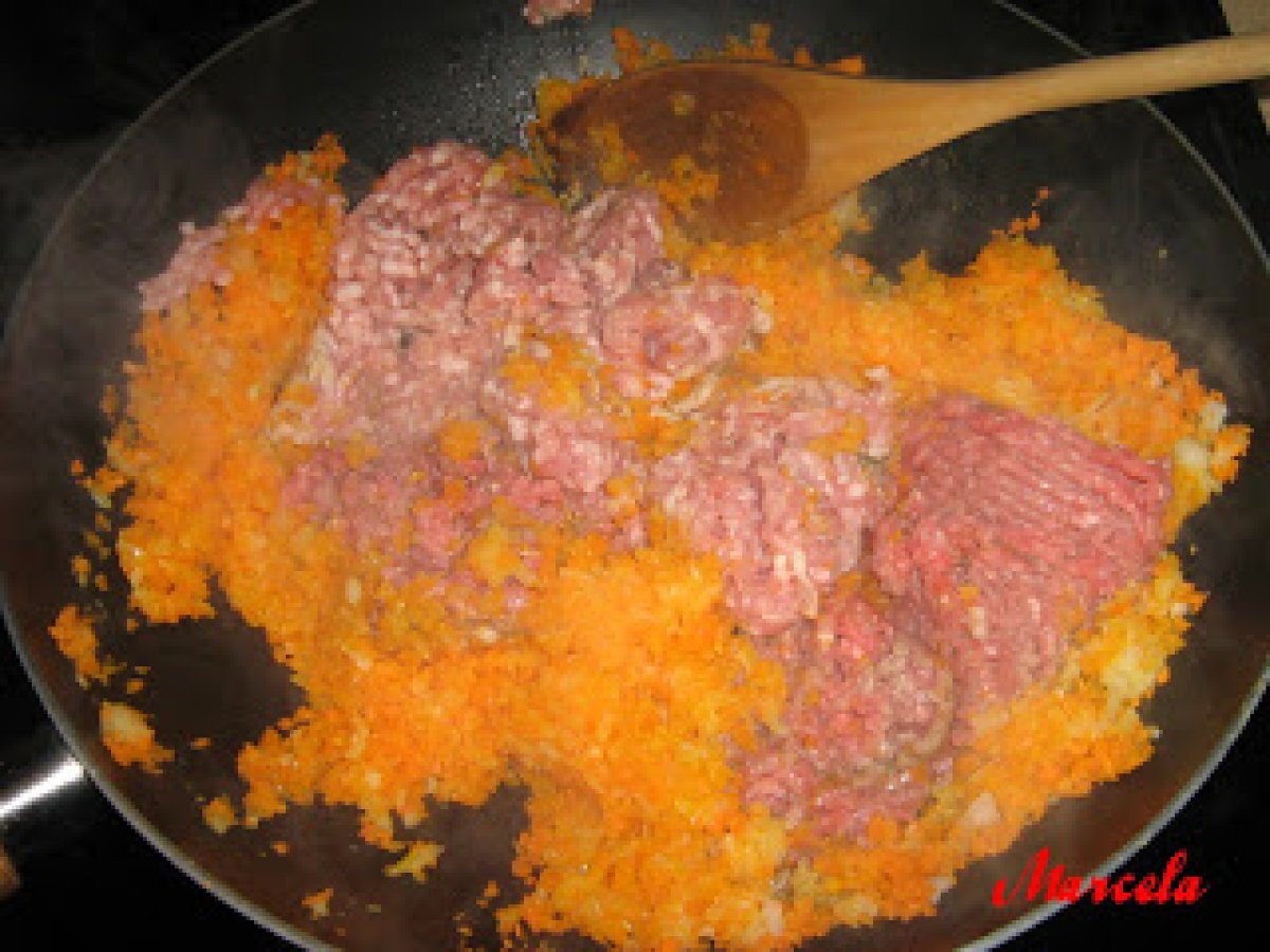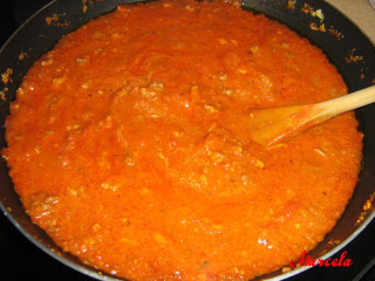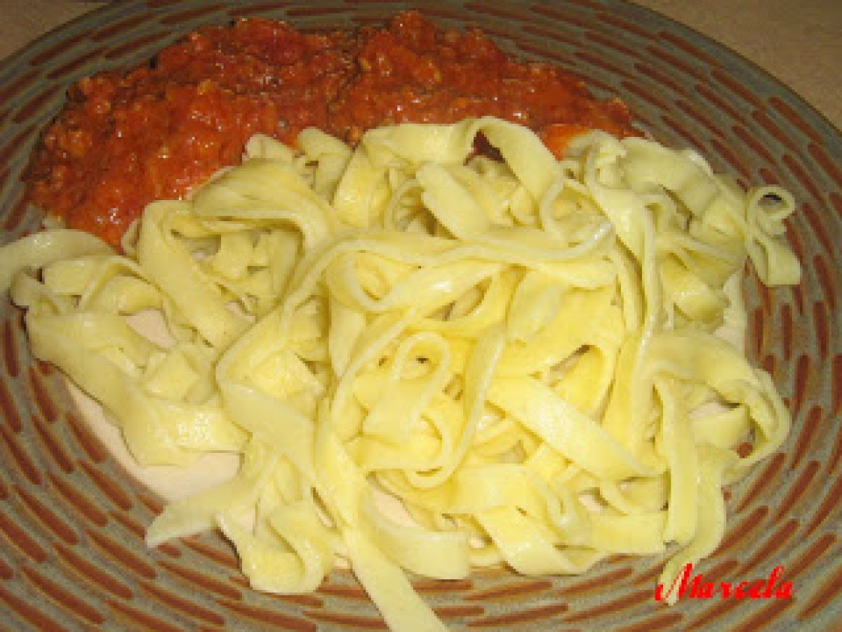 Fettucine cu sos de tomate si carne tocata PrecedentulUrmătorul Felul principalFoarte ușor30 min Trimite unui prieten Printează pagina Adresează o întrebare autorului Postează o poză cu rețeta gătită de tine Ingrediente 4 Pentru sos: 1 morcov mare 1 ceapa mare 3 catei usturoi 1/2kg carne tocata de vita & porc 1 conserva mare de rosii intregi cu spices pasta tomate 2 linguri de pesto balsamic vegeta, sare, piper fettucine 2-3 linguri ulei masline