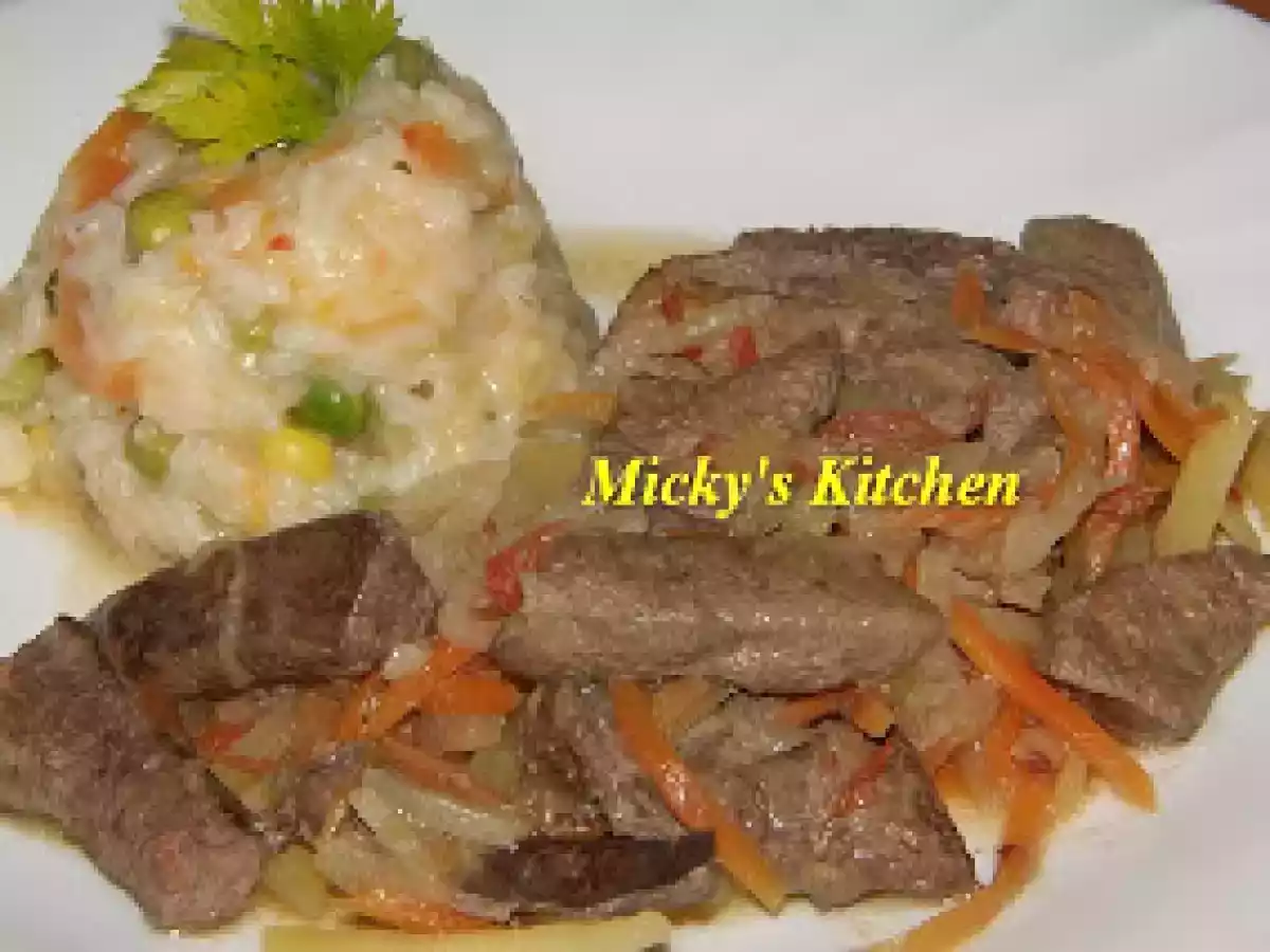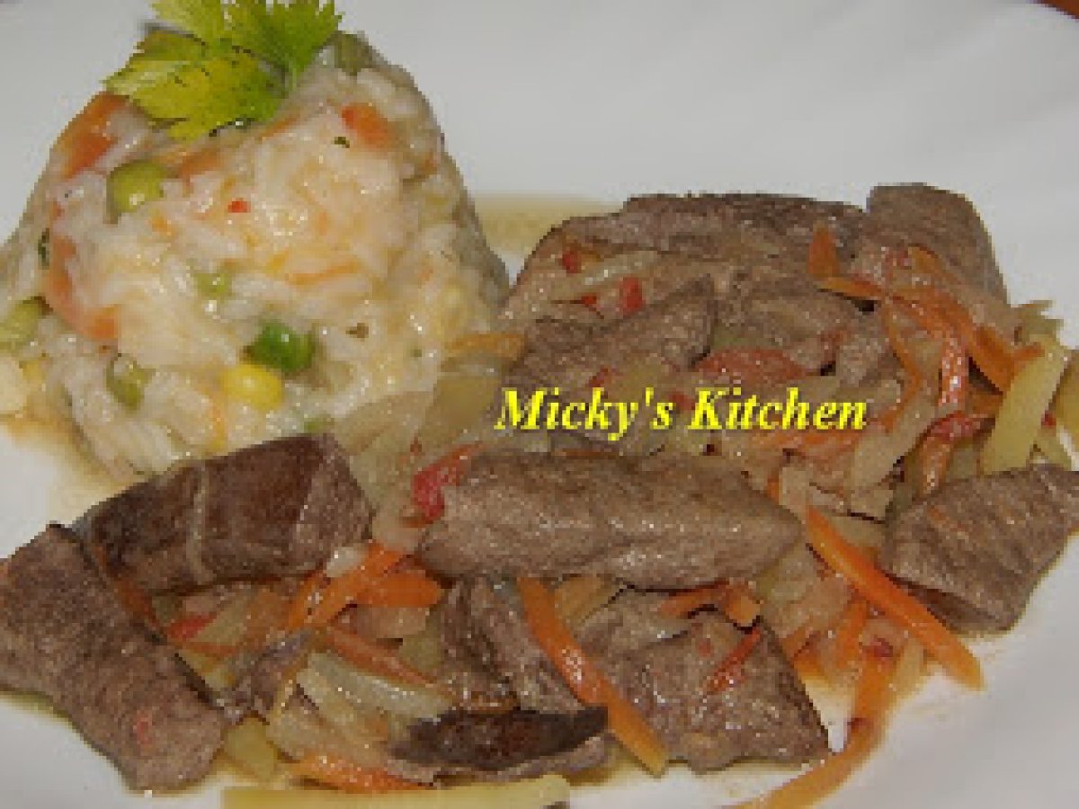 Ficat de porc cu legume Felul principalFoarte ușor35 min Trimite unui prieten Printează pagina Adresează o întrebare autorului Postează o poză cu rețeta gătită de tine Ingrediente 4 500 g ficat de porc, 2 buc ceapa, 2 buc morcov, 1 buc cartof, 1 buc ardei gras rosu, 100 ml vin alb sec, 1 buc ghimbir sare piper.