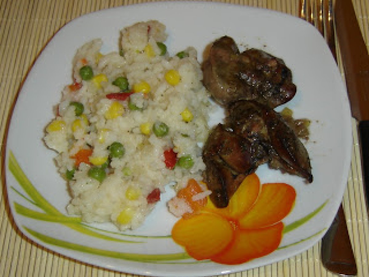 Ficatei de pui cu orez si legume PrecedentulUrmătorul Felul principalFoarte ușor40 min Trimite unui prieten Printează pagina Adresează o întrebare autorului Postează o poză cu rețeta gătită de tine Ingrediente 4 1 caserola ficatei de pui 1 punga amestec gradinaresc de legume 2 pungi orez (pentru 4 portii) 2 cepe condimente putin ulei