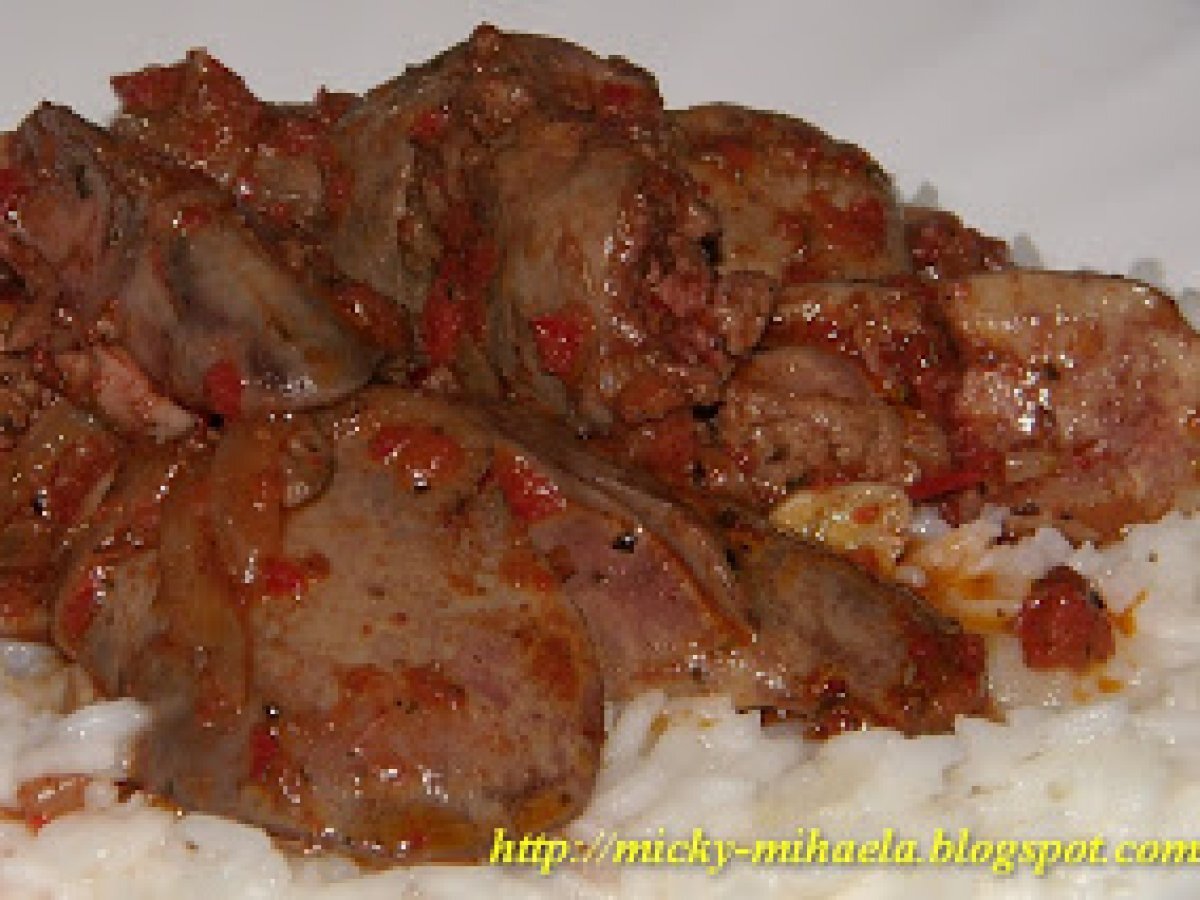Ficatei de pui in stil mediteraneean Felul principalFoarte ușor35 min318 Kcal Trimite unui prieten Printează pagina Adresează o întrebare autorului Postează o poză cu rețeta gătită de tine Ingrediente 3 500 g ficatei de pui, 1 ceapa, 5 catei de usturoi 1 ardei gras rosu, 100 ml vin alb, 1/2 lingurita busuioc, 1/2 lingurita oregano, ulei de masline, sare, piper. Cost estimat: 7.83Euros€ (2.61€/porție)