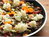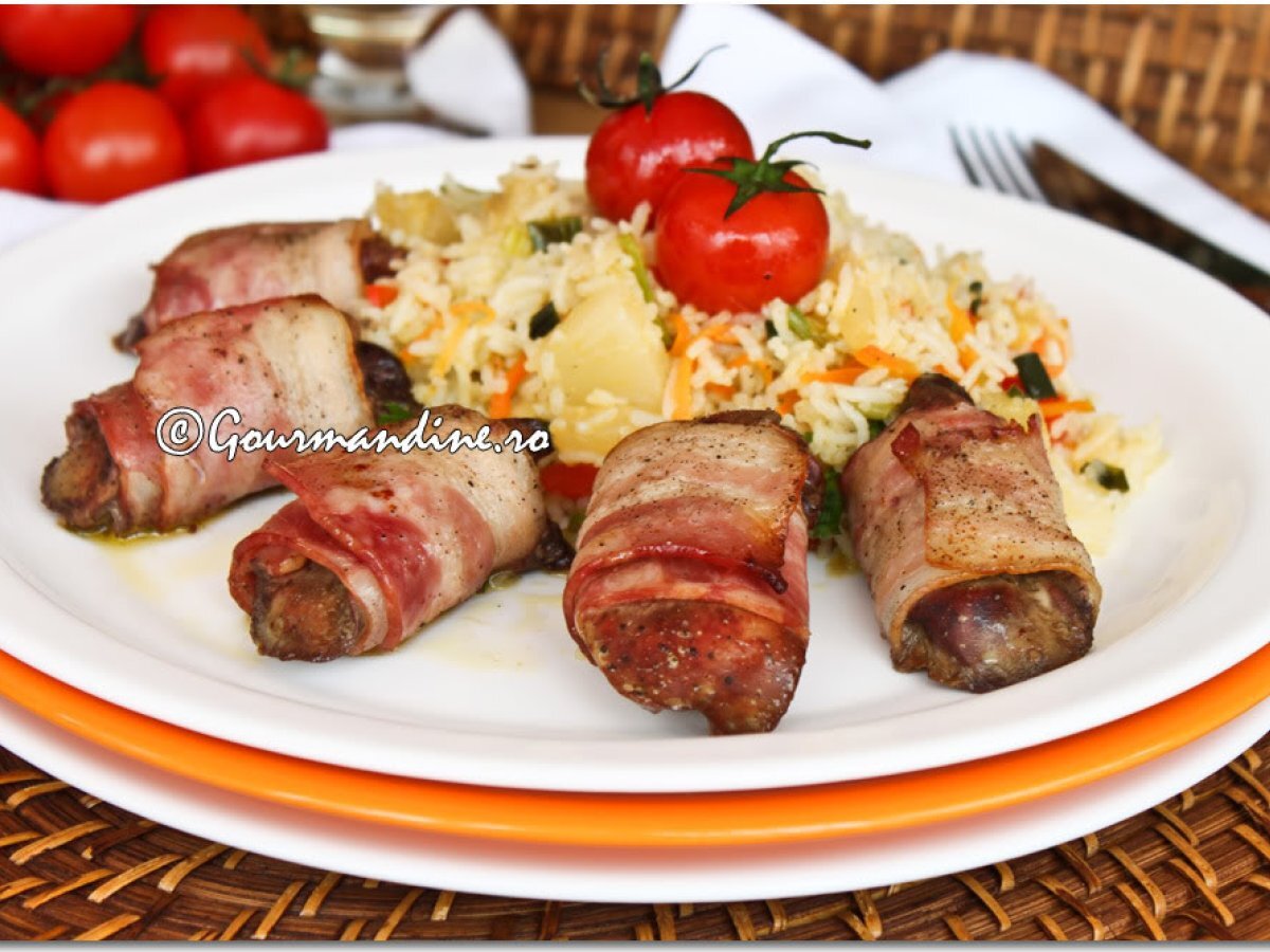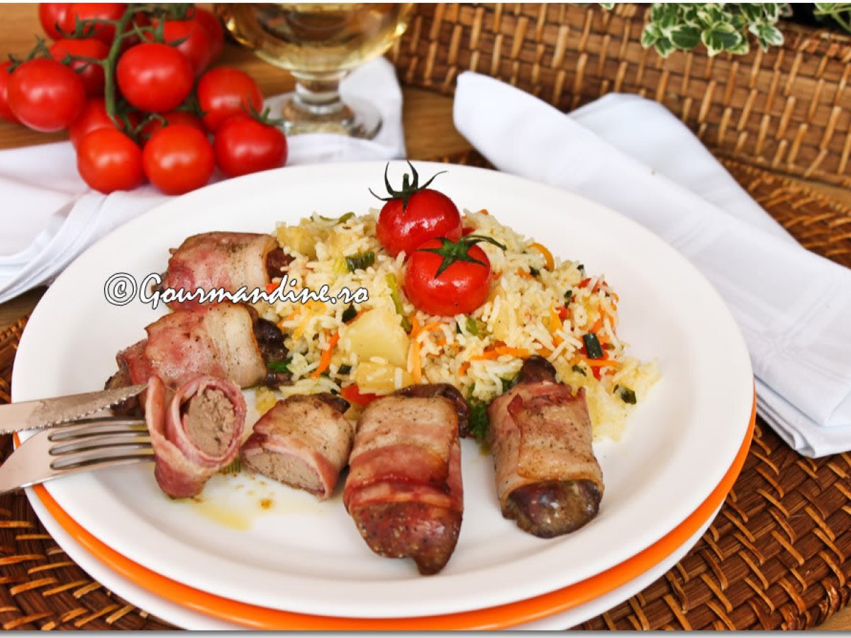 Ficatei de pui inveliti in bacon cu garnitura de orez cu ananas, legume si curry PrecedentulUrmătorul Felul principalFoarte ușor1 oră Trimite unui prieten Printează pagina Adresează o întrebare autorului Postează o poză cu rețeta gătită de tine Ingrediente 6 Pentru ficateii de pui inveliti in bacon: Ficatei de pui Felii de bacon Sare si piper, dupa gust 5-6 catei de usturoi Ulei Pentru orezul cu legume, ananas si curry: 1 ardei rosu mare 1 ardei iute verde mare 300 g ananas 2 morcovi mari 2-3 fire de ceapa verde Sare, piper si curry, dupa gust Ulei Orez basmati