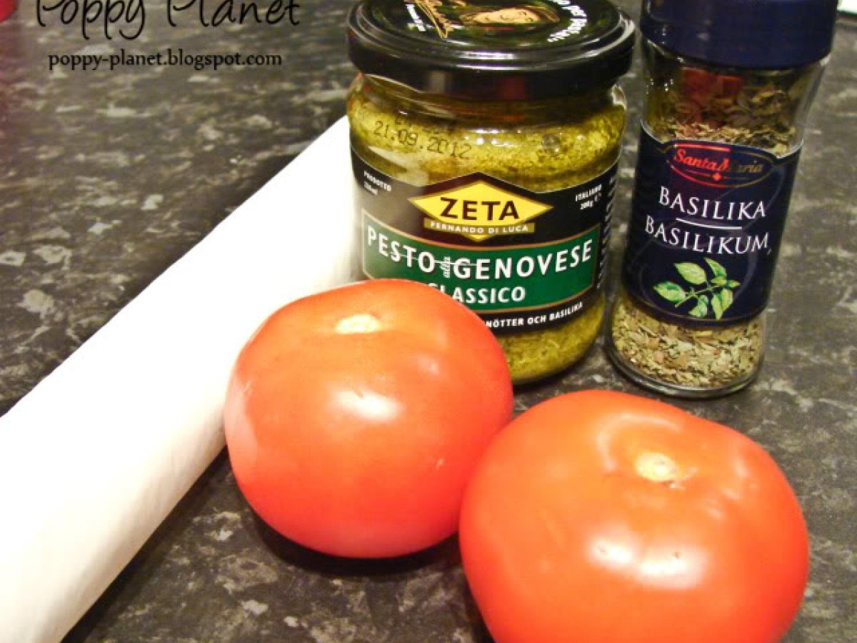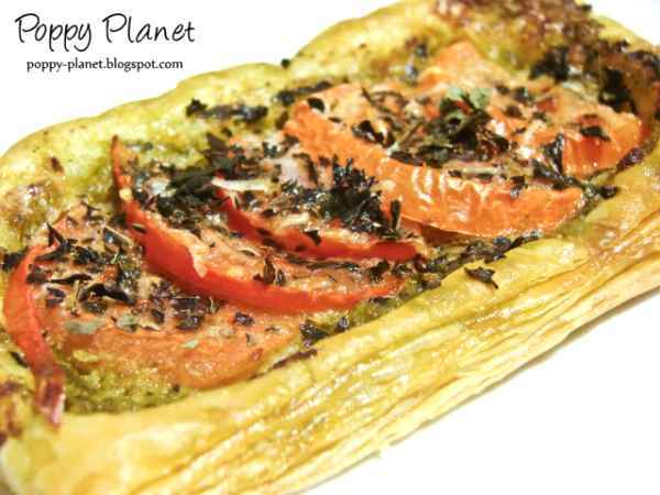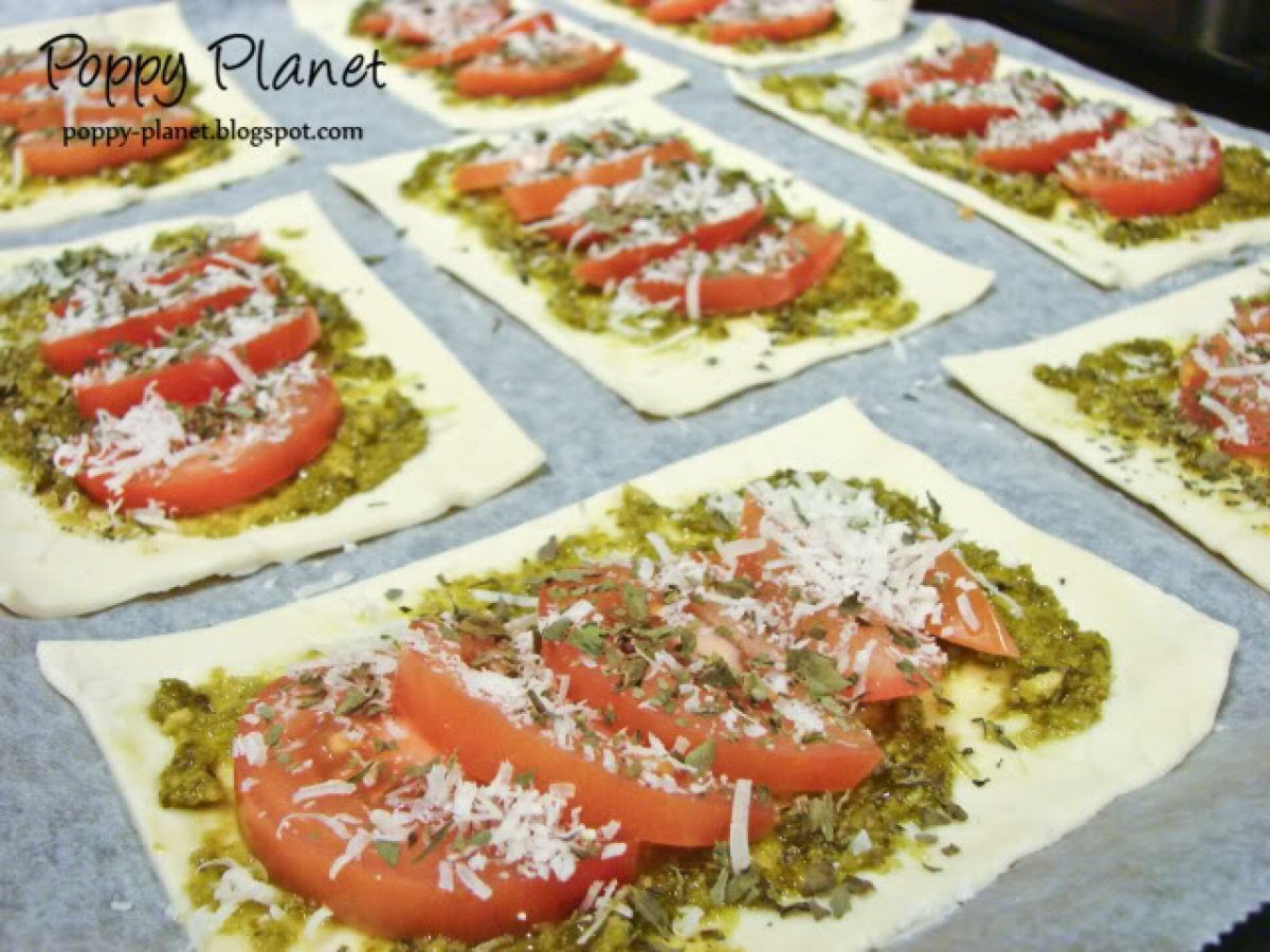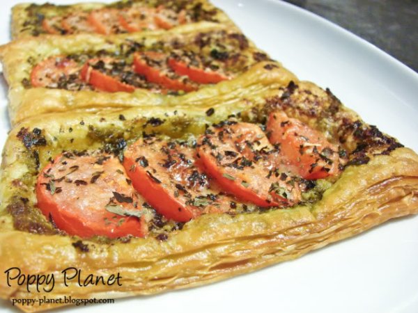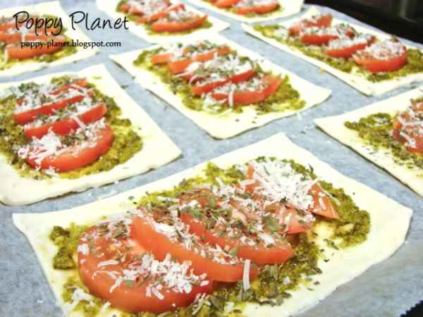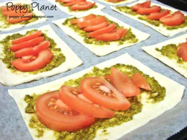Foietaj cu pesto si rosii PrecedentulUrmătorul Felul principalFoarte ușor50 min Trimite unui prieten Printează pagina Adresează o întrebare autorului Postează o poză cu rețeta gătită de tine Ingrediente 2 aluat foietaj 4 rosii (nu va uitati la poza :) ) pesto parmezan ras busuioc