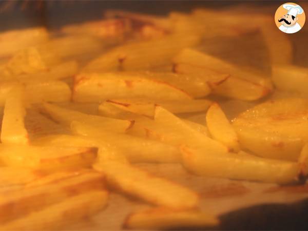 Pregatiti cartofii prajiti: Se curata si se taie cartofii sub forma de pai. Amestecati-i cu uleiul de masline si sarea si puneti-i pe o tava acoperita cu hartie copt si bagati in cuptor timp de 20 de minute la 220° C.