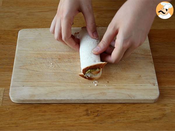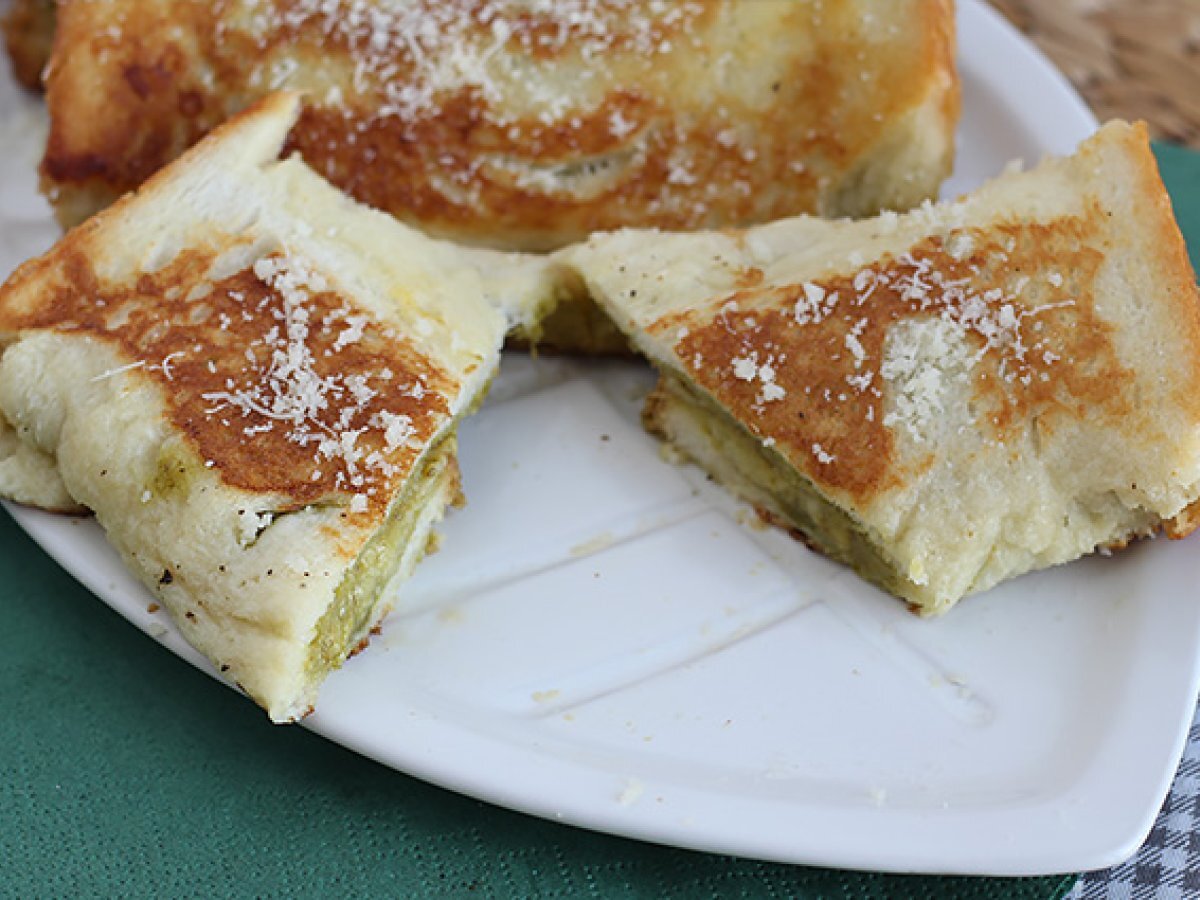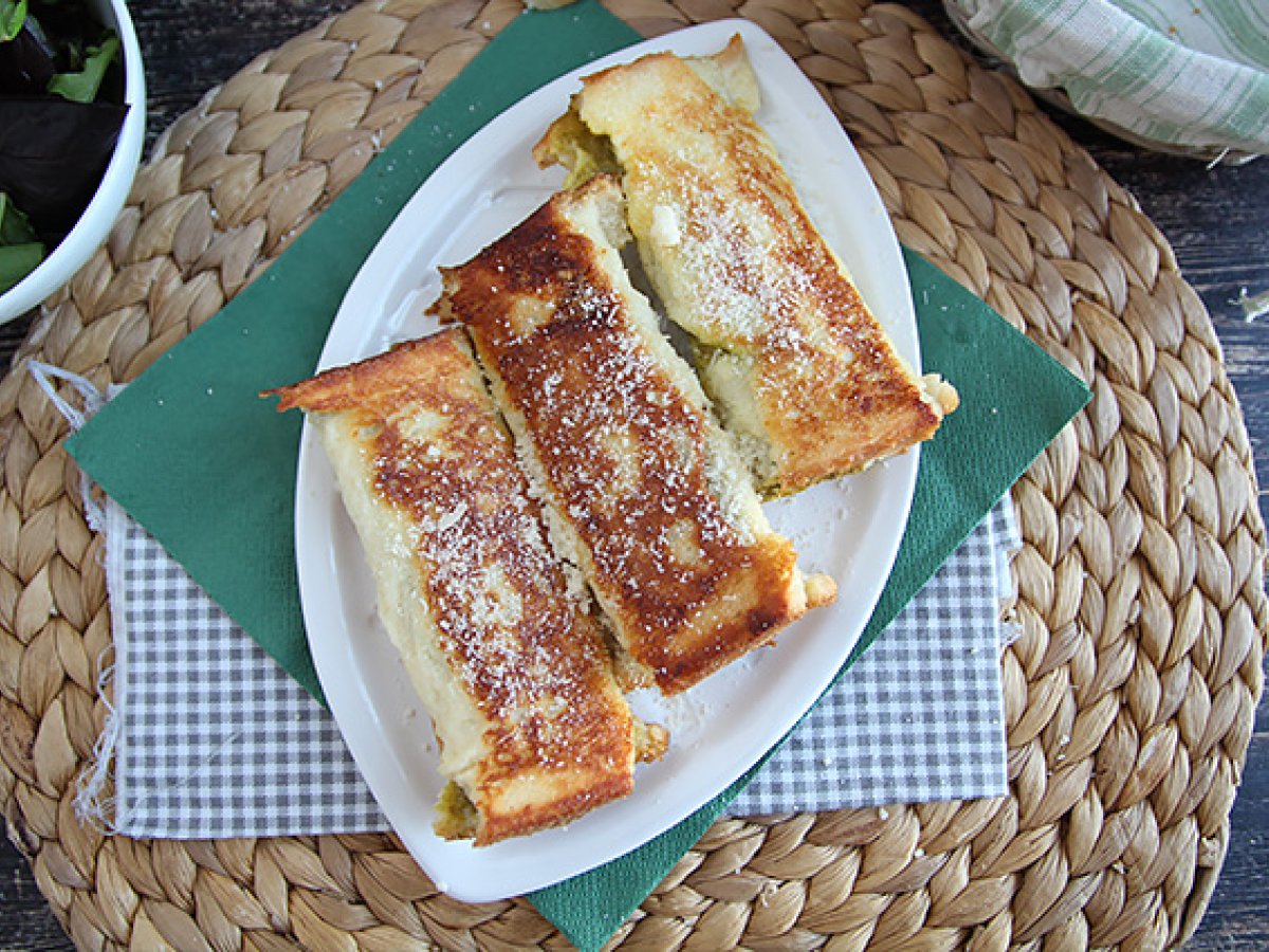 Întindeti pesto pe toata suprafata felii de paine. Acoperiti cu parmezan ras (aproximativ 1 lingura). Îndoiti painea în 3.