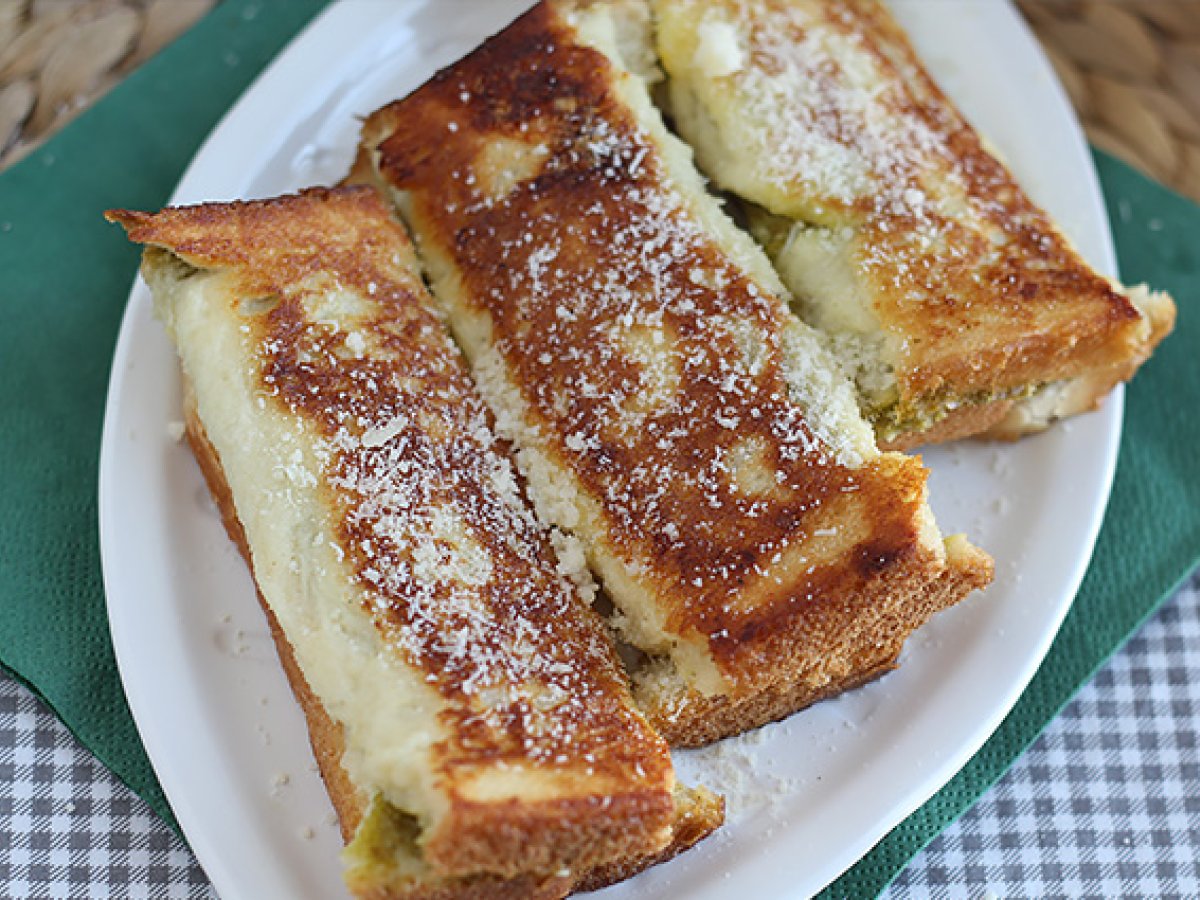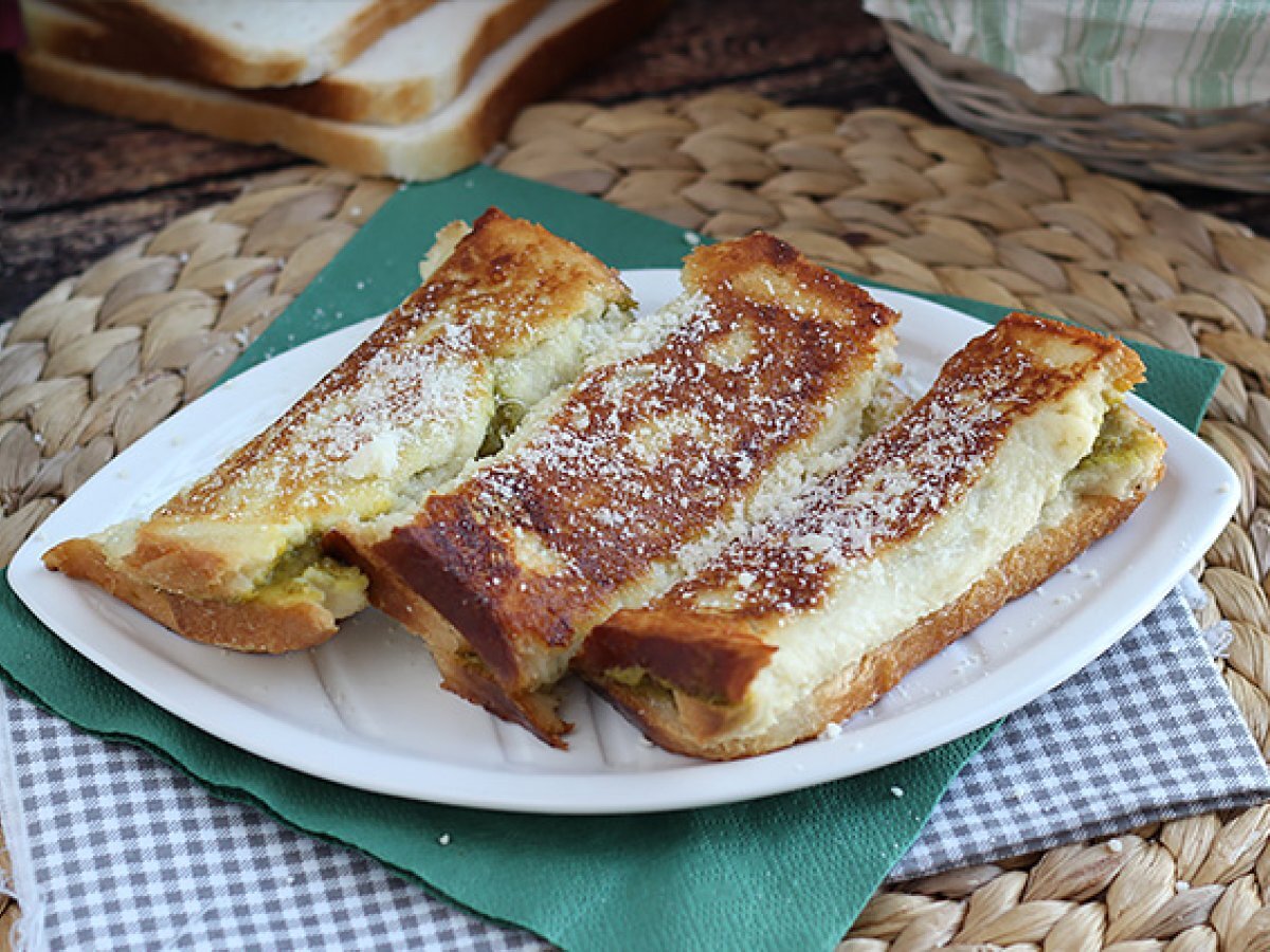 Ingredientele esențiale includ felii de pâine, pesto, parmezan ras, ou, lapte, ulei de măsline, sare și piper.