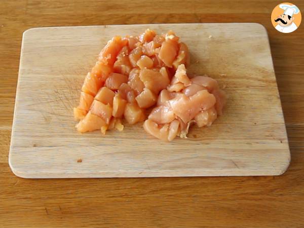 Taiati pieptul de pui in bucati (ganditi-va la dimensiunea pe care o avea dupa ce se vor gati.).