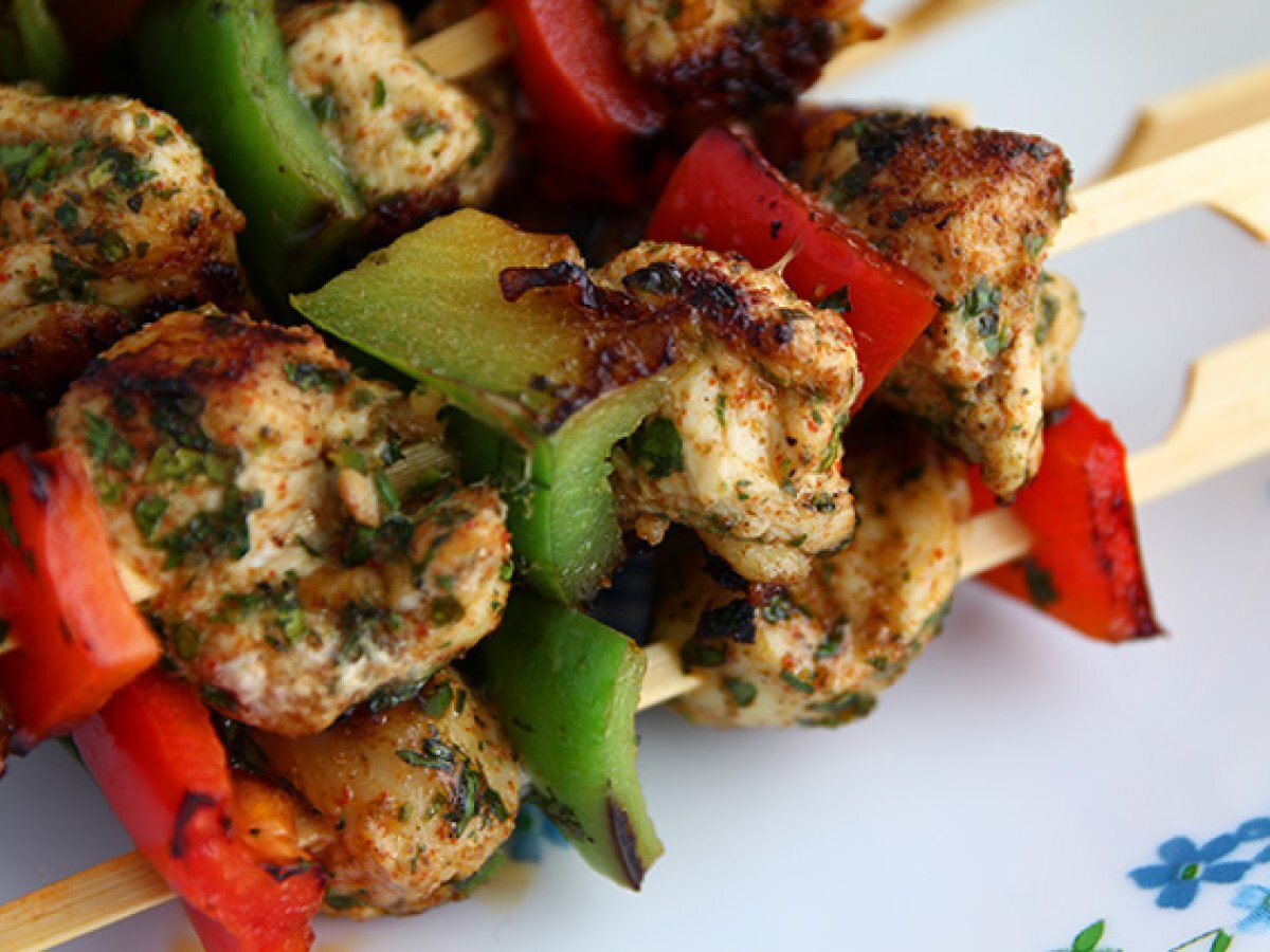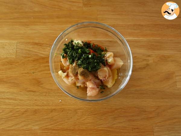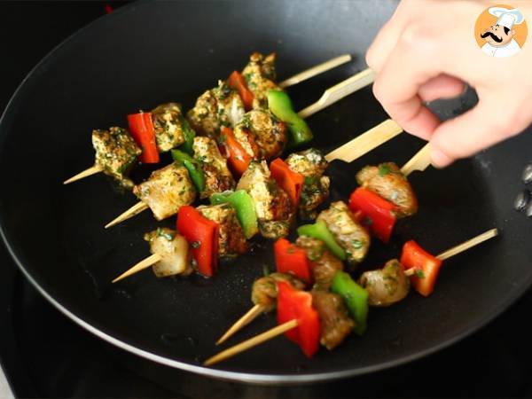 Dupa acest timp, taiati ardeiul in bucati de dimensiunea bucatilor de pui. Puneti-le alternativ pe bete impreuna cu carnea de pui.