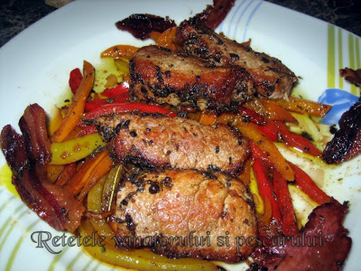 Friptura de caprioara cu legume si pastrama de mistret PrecedentulUrmătorul Felul principalFoarte ușor45 min Trimite unui prieten Printează pagina Adresează o întrebare autorului Postează o poză cu rețeta gătită de tine Ingrediente 6 un muschiulet de caprioara 5-6 felii din pastrama de mistret 1/2 ardei gras rosu 1/2 ardei gras galben 1/2 ardei gras portocaliu ulei de masline cat considerati ca va trebuie 2 linguri de otet din vin alb 2 cubulete de unt 3 catei de usturoi cimbru proaspat 4-5 crengute ienibahar sare si piper dupa gust