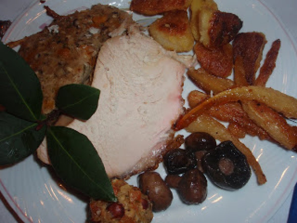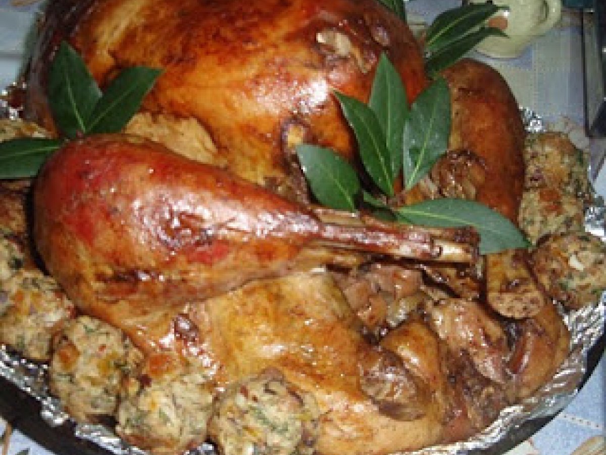 Friptura de curcan cu sos de vin rosu PrecedentulUrmătorul Felul principalFoarte ușor1 h 15 m Trimite unui prieten Printează pagina Adresează o întrebare autorului Postează o poză cu rețeta gătită de tine Ingrediente 8 o ceapa taiata sferturi frunze de dafin un curcan pregatit pentru copt, aproximativ 4-5 - - 5.6 kg o cantitate de umplutura 85 g unt topit 1 varf de cutit de nucsoara macinata 10 felii de bacon 1 pahar de vin rosu sare, piper