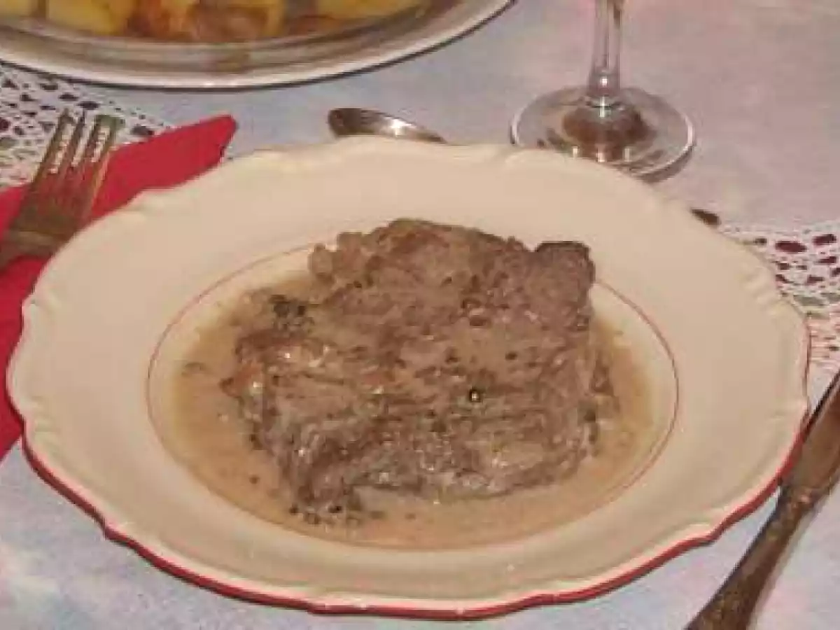 Friptura de vita cu sos de piper verde (pfeffersteak) Felul principalUșor40 min Trimite unui prieten Printează pagina Adresează o întrebare autorului Postează o poză cu rețeta gătită de tine Ingrediente 6 800 gr vita 3 linguri boabe de piper verde 100 gr de unt 100 ulei de masline 150 ml smântâna 6 lg cognac (merge si sherry) sare