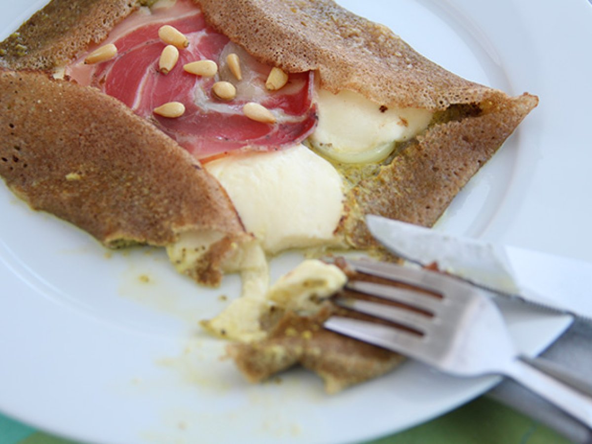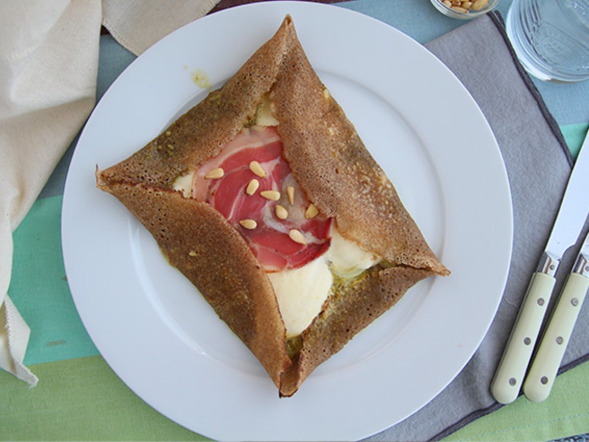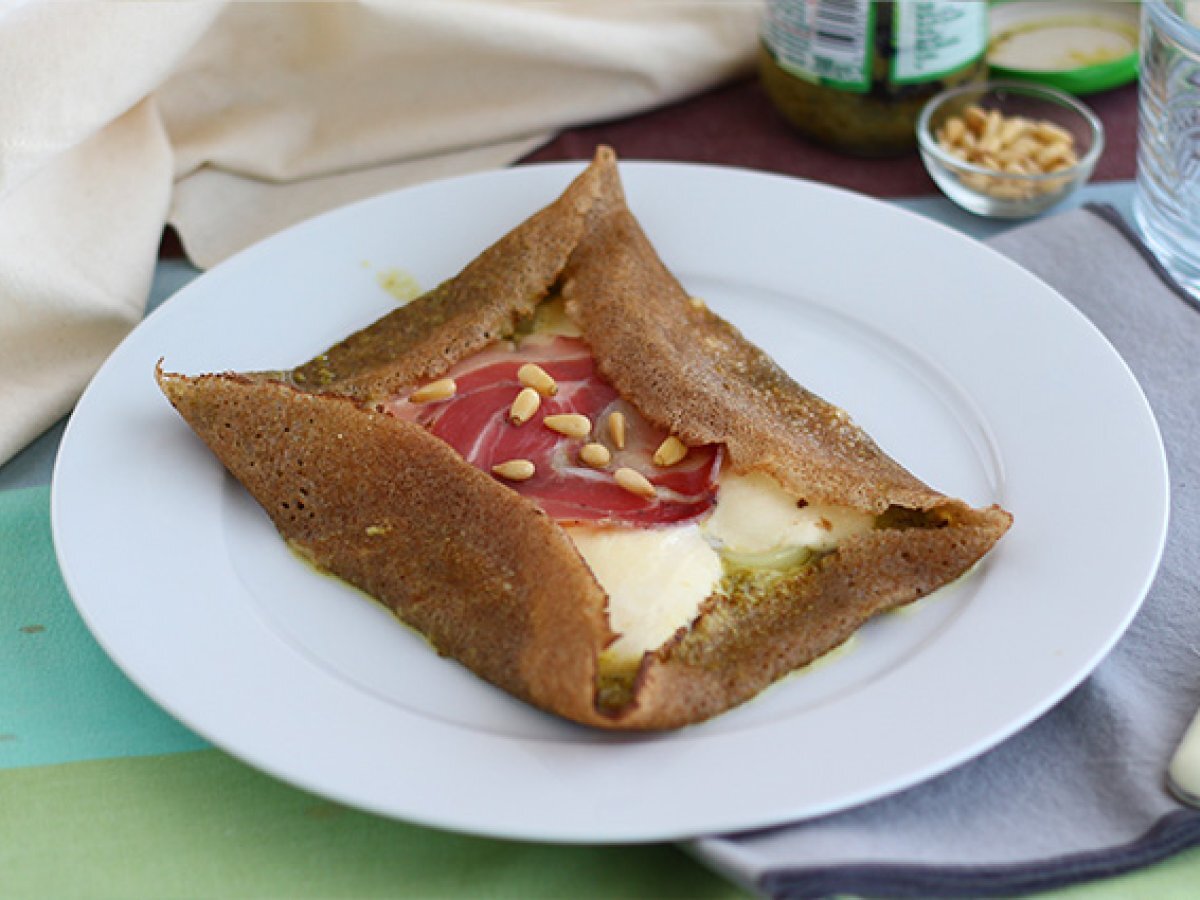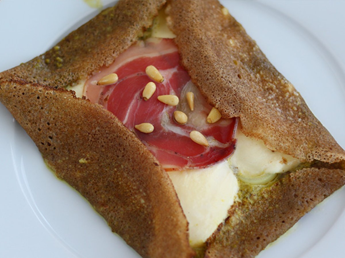 Ingredientele principale includ: 1 linguriță de unt, 1/4 ceapă, 1 galette de hrișcă, 2 lingurițe de pesto, 4 felii de mozzarella, 1 felie de pancetta și 6-7 semințe de pin.
