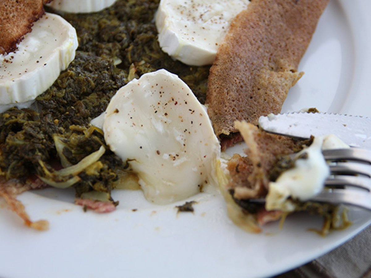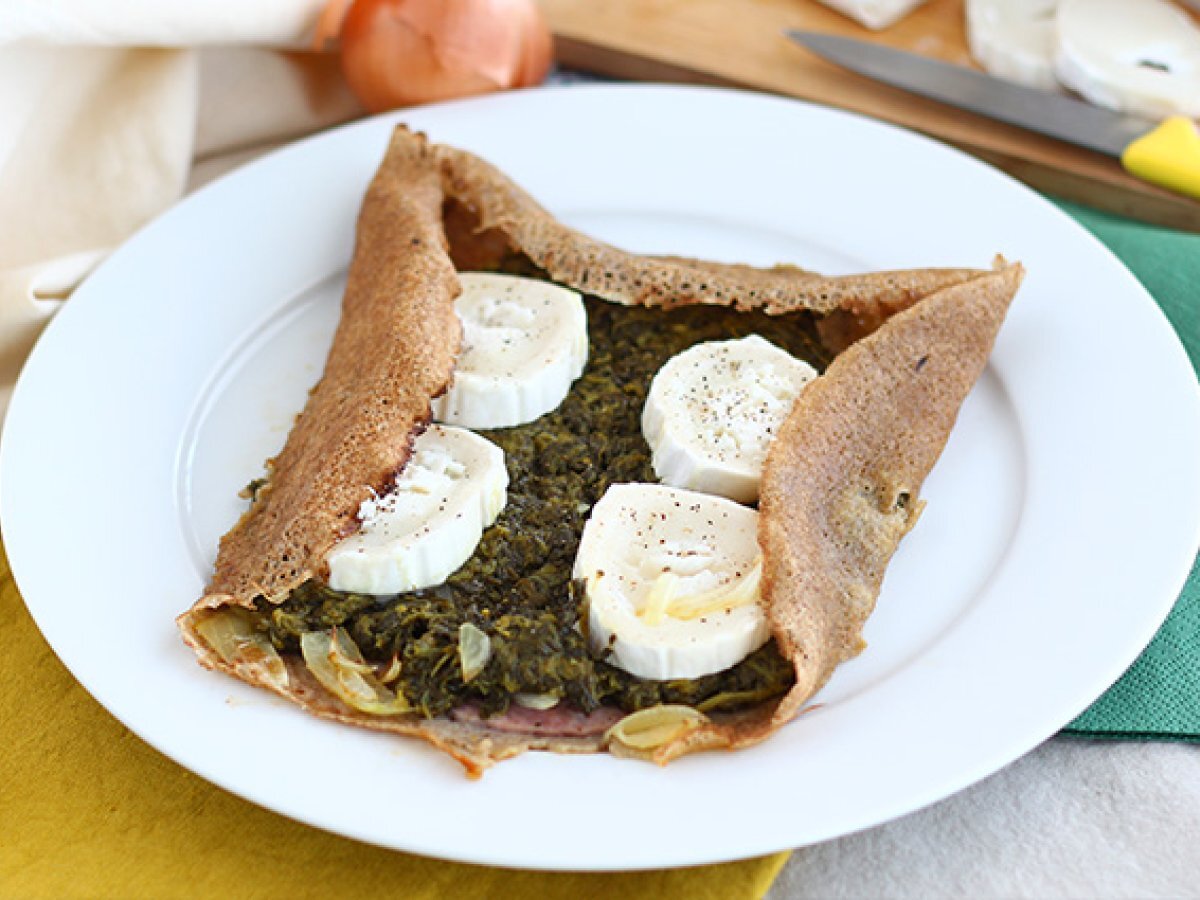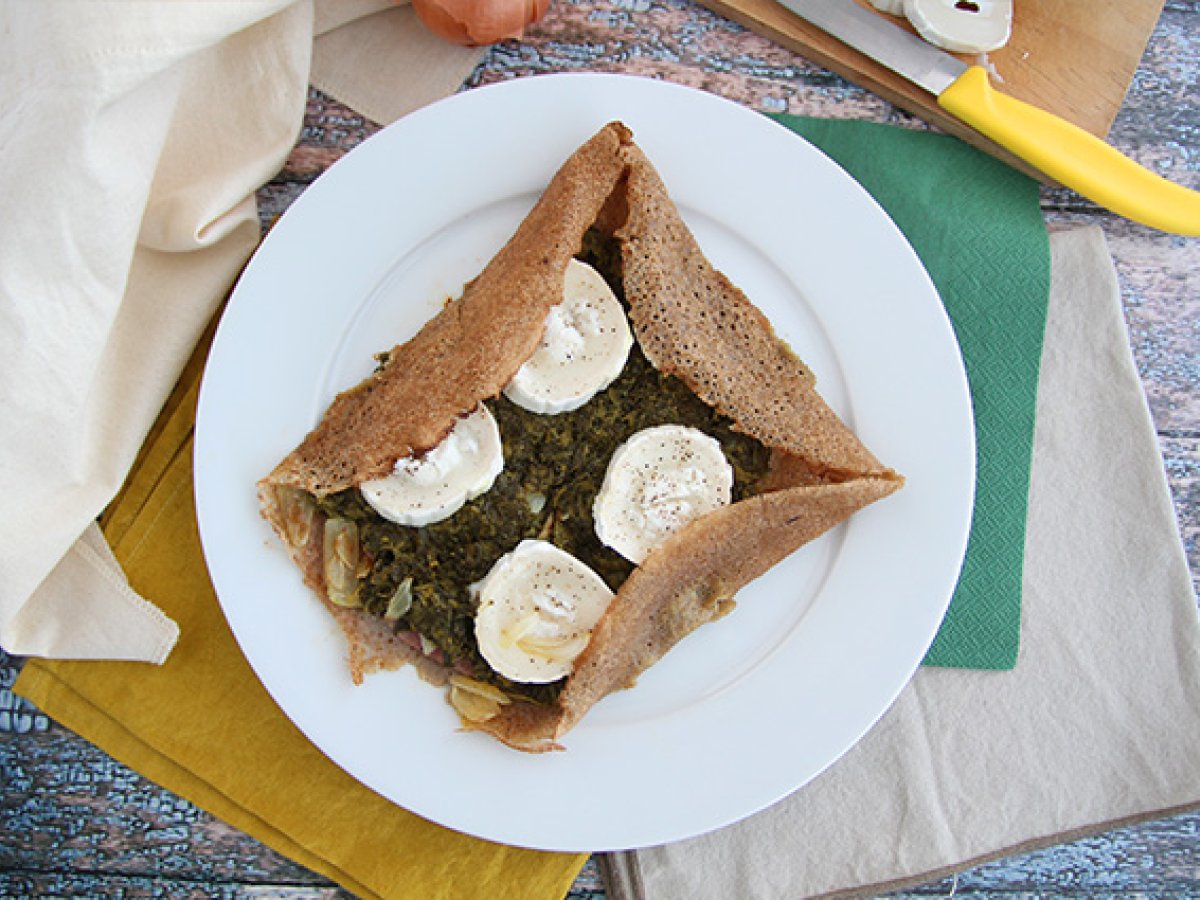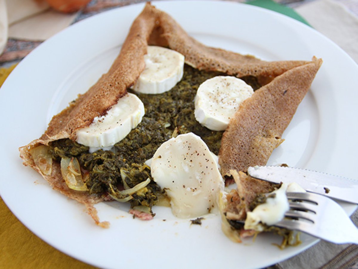 Ingredientele necesare includ: unt, ceapă, galette de hrișcă, șuncă presată, spanac fiert sau crud, brânză de capră, sare și piper.