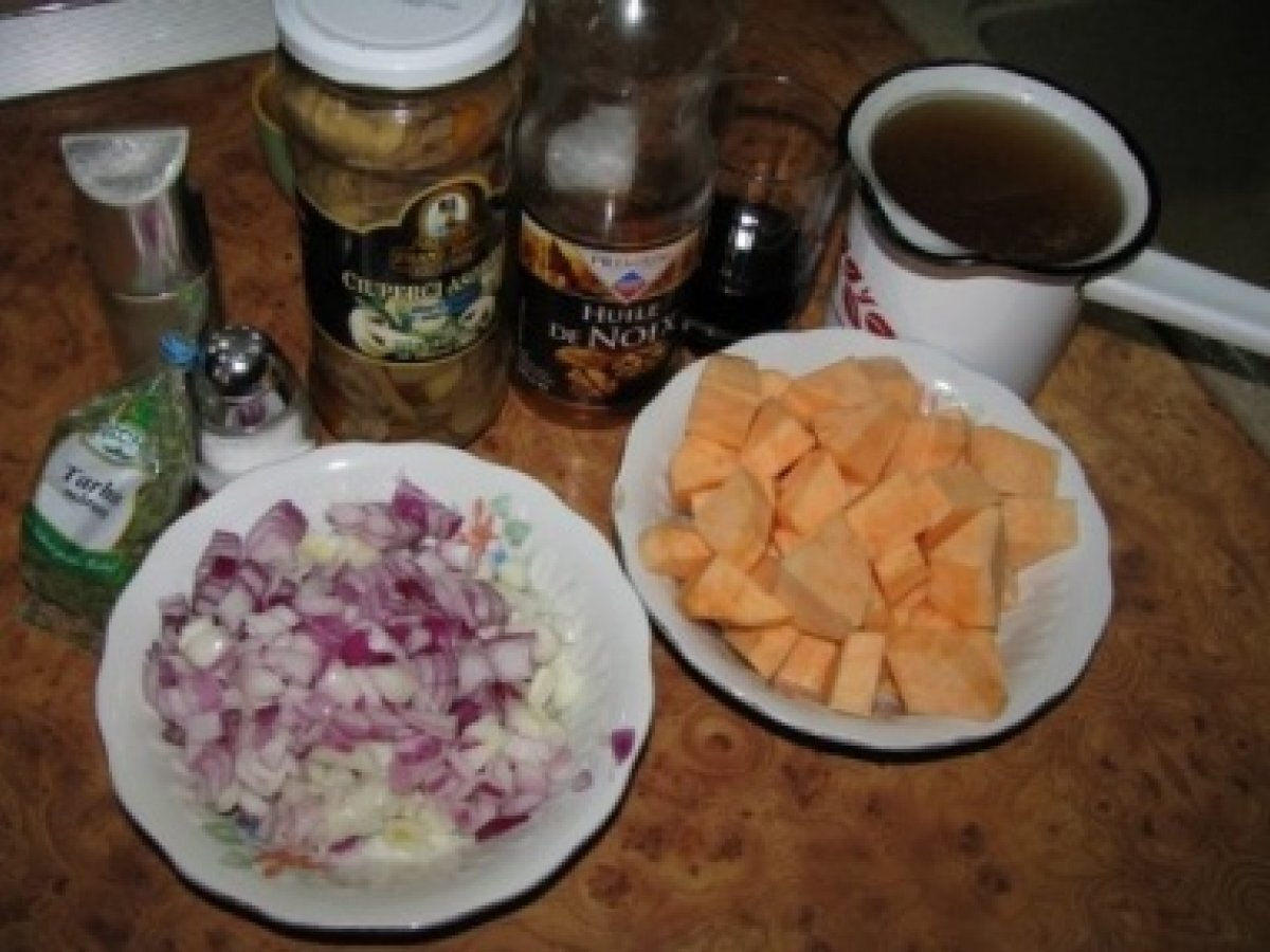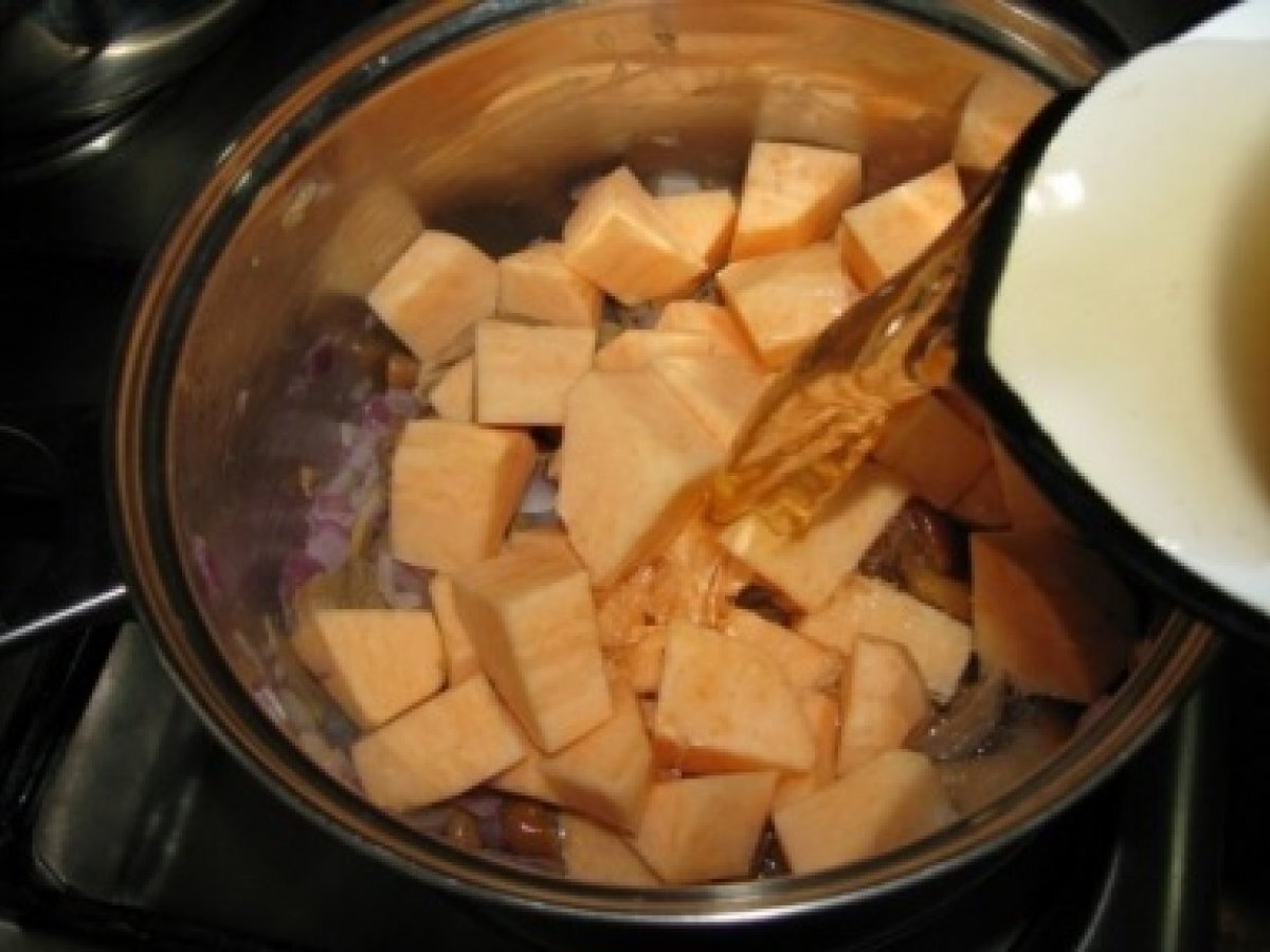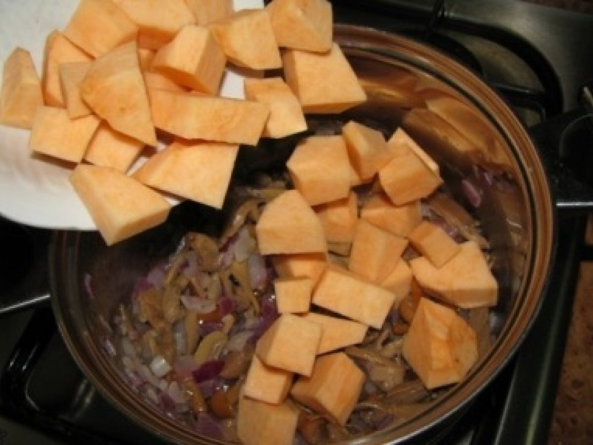 Ghiveci cu ciuperci si cartofi dulci PrecedentulUrmătorul Felul principalFoarte ușor1 h 25 m Trimite unui prieten Printează pagina Adresează o întrebare autorului Postează o poză cu rețeta gătită de tine Ingrediente 4 450 g mix de ciuperci 1 lingura ulei de nuci 200 g ceapa, tocata 500 g cartofi dulci, decojiti si taiati cuburi 2 linguri sos de soia 700 ml bullion de legume sare si piper negru 2 linguri tarhon, tocat
